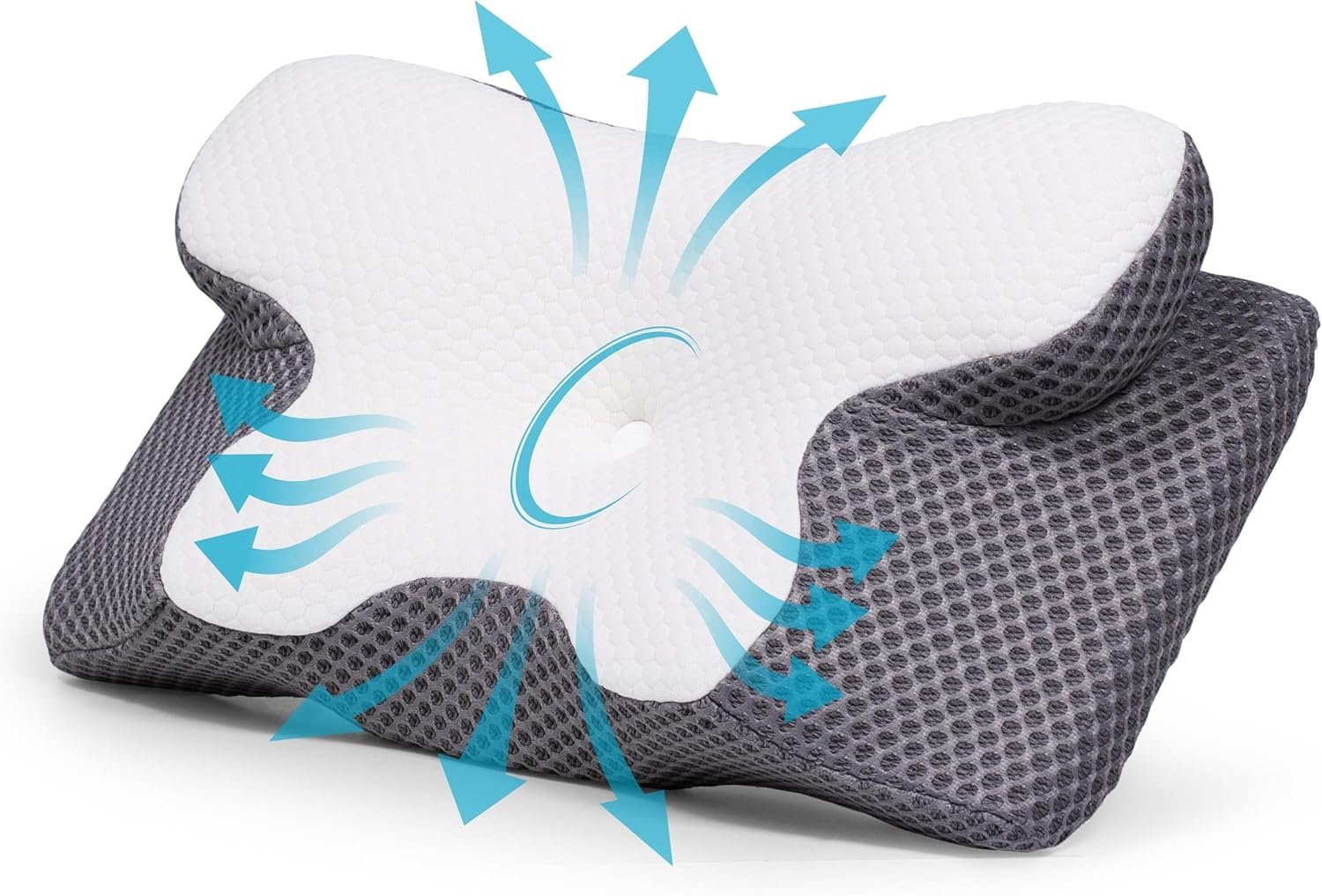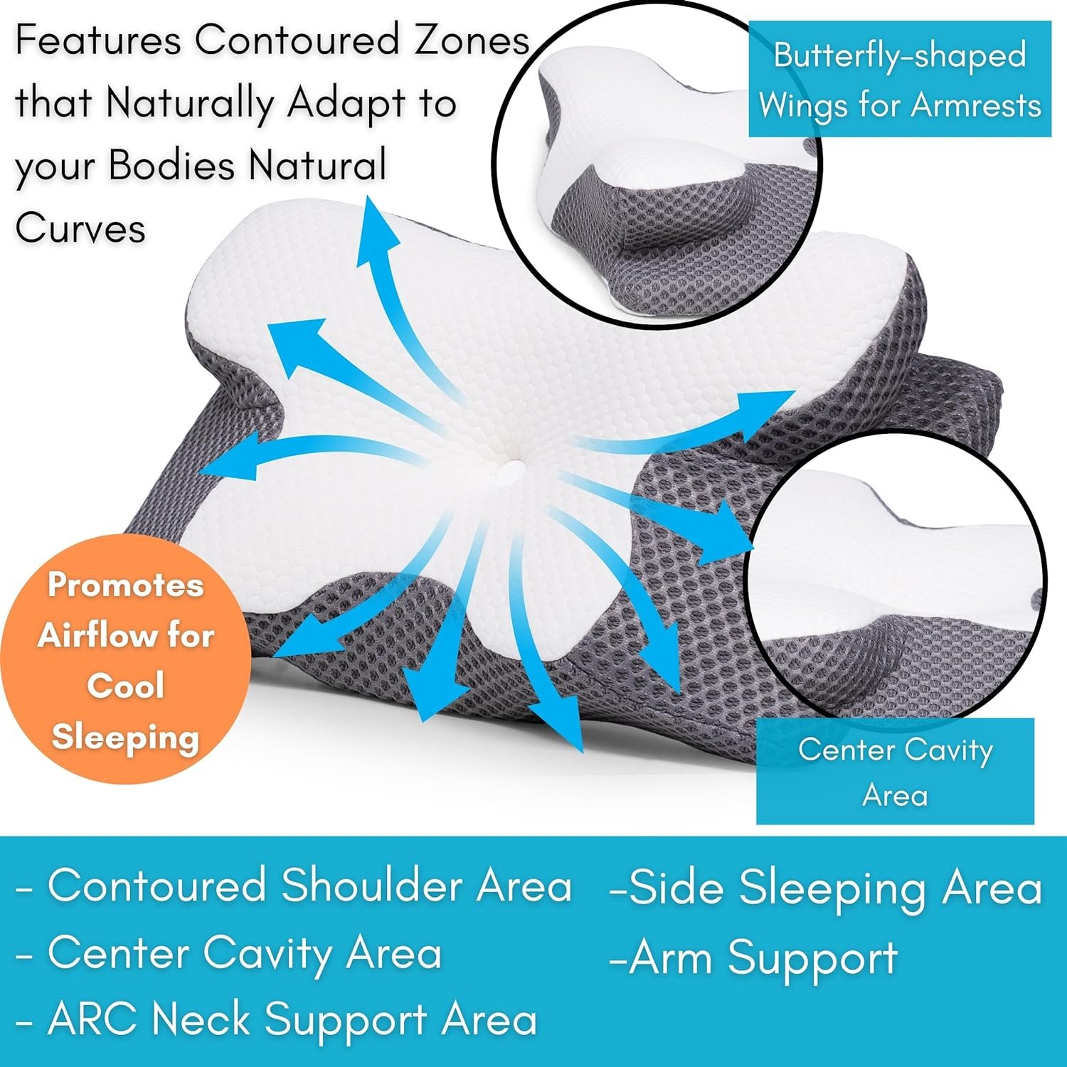 Multifunctional Pillow Zones: Featuring multifunctional pillow zones like side sleeping area, arm support, contoured shoulder area, center cavity area, and ARC neck support area. An ideal cervical pillow for neck pain relief or side sleepers. The butterfly-shaped wings also provide a comfy armrest spot.