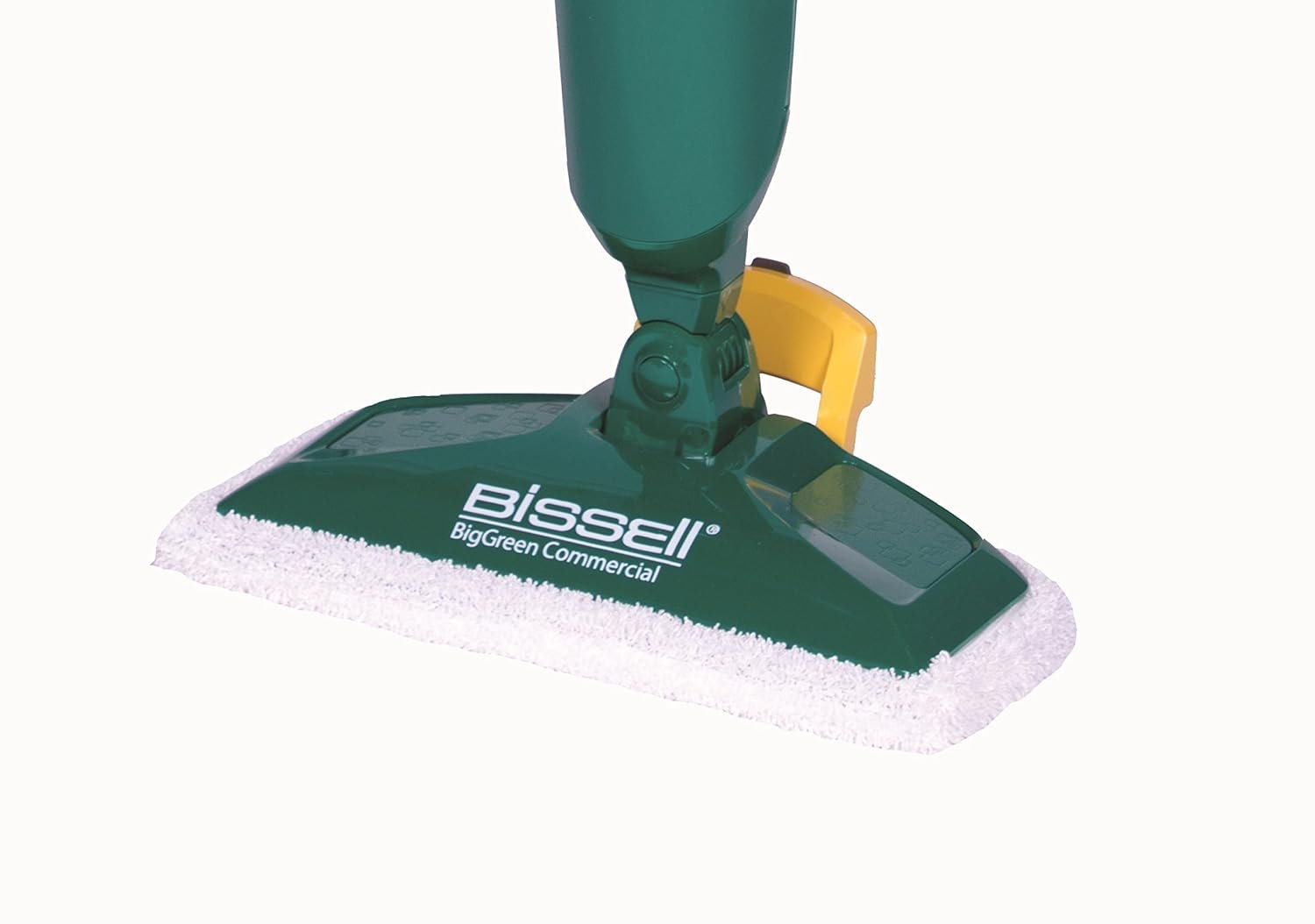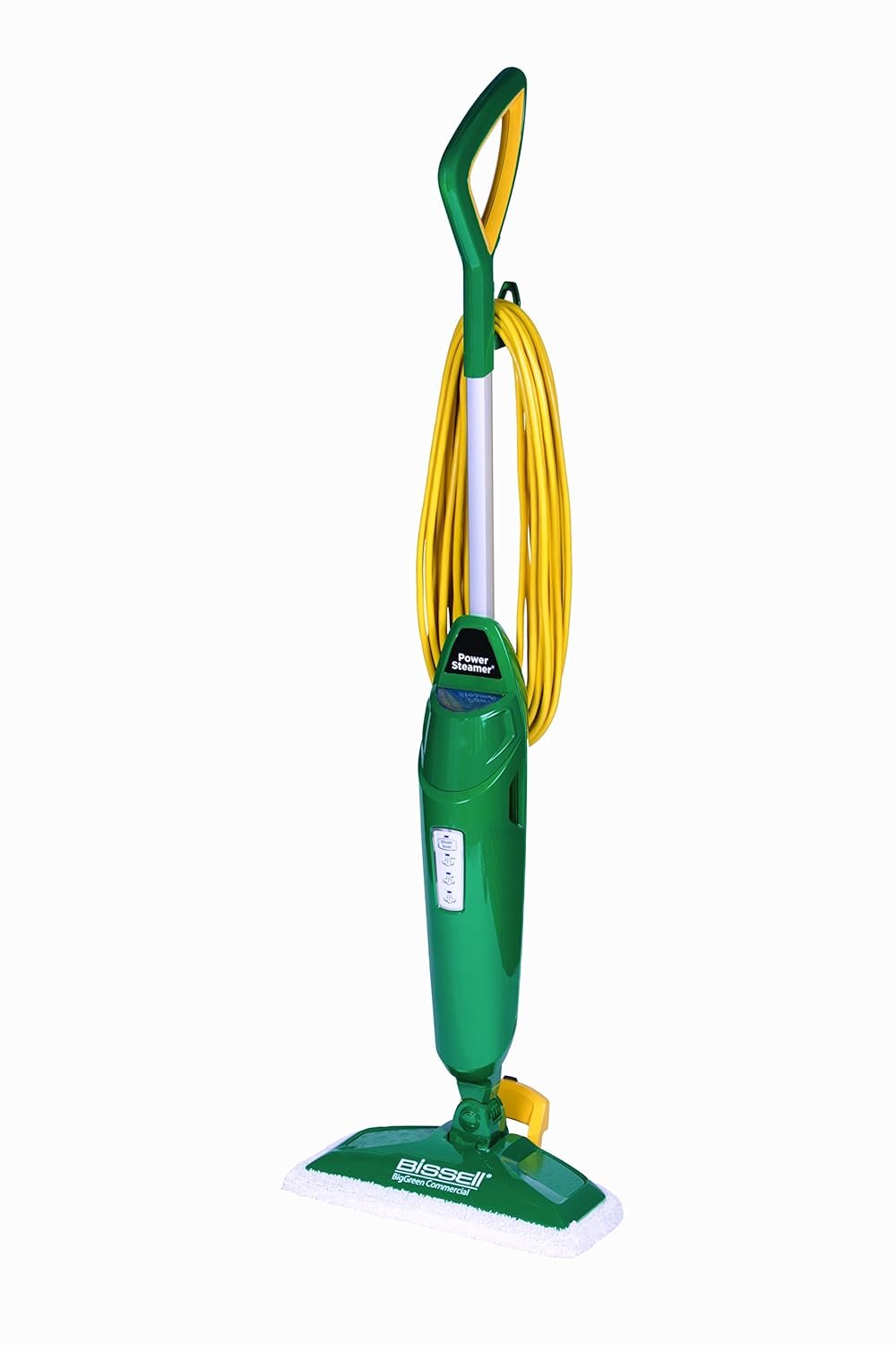 PowerSteamer Steam Mop. Give your hard floors a shiny, sanitized clean with the variable, digital steam control the BISSELL BIG GREEN COMMERCIAL PowerSteamer Mop. Armed with the handy, flip-down Easy Scrubber, you can thoroughly clean tough messes and even grout. Clean sticky, dried-on spots 2X faster than the leading steam mop with a built-in Easy Scrubber. Now clean, sanitized floors are a simple steam away. Sanitize floors with the BISSELL BIGGREEN COMMERCIAL PowerSteamer Steam Mop, which eliminates 99.9% of germs and bacteria when used as directed. Shine floors while you clean sticky, dried-on spots 2X faster than the leading steam mop with the built-in Easy Scrubber or scrubby microfiber mop pad. Remove tough spots with the built-in, flip-down Easy Scrubber. 3 Washable Microfiber Mop Pads, Two soft pads for everyday and one scrubby pad for heavy messes. Customize your clean with the SmartSet digital, variable steam control (low, medium, high).