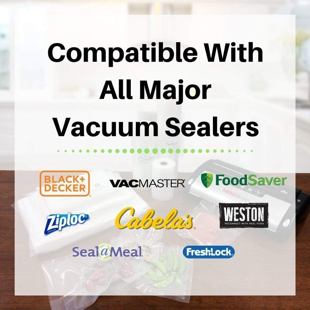 WORKS WITH ALL BRANDS OF VACUUM SEALER MACHINES – FoodVacBags can be used in any counter top vacuum sealer, like Cabela’s, Foodsaver(TM), Ziploc