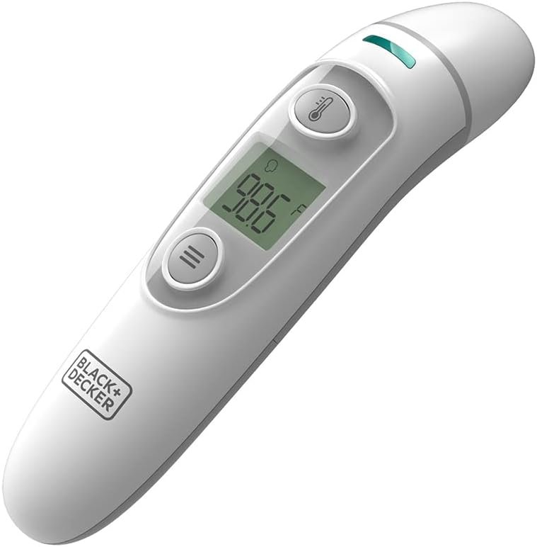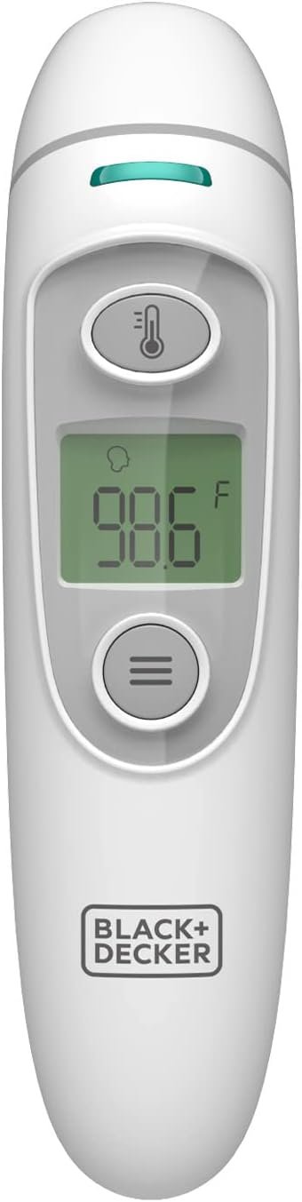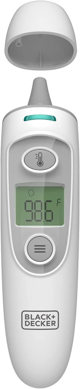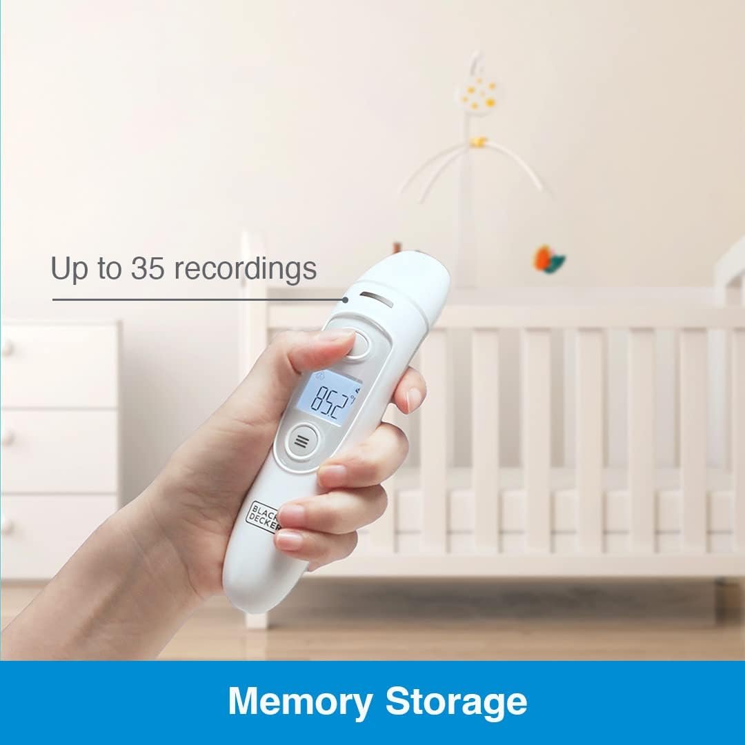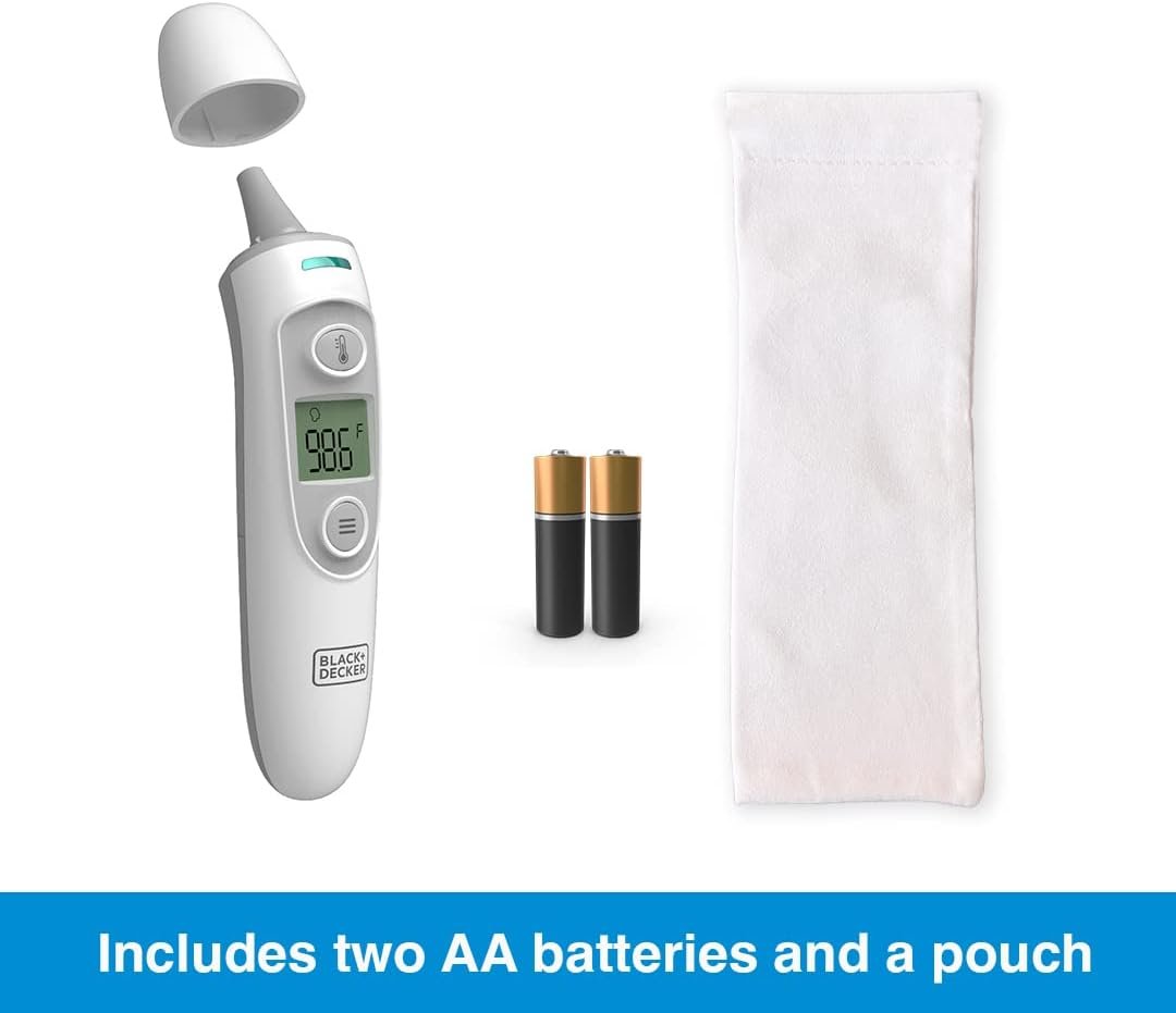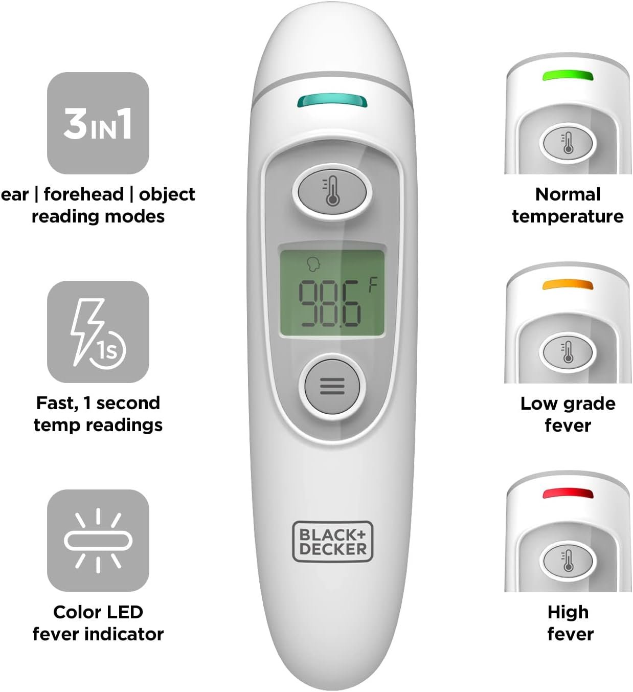 BLACK+DECKER 3-in-1 Infrared Thermometer recommended for babies, suitable for all ages. Ear/Forehead/Object modes. Fast response + accurate: health protection for the whole family. One second temp readings. Large, backlit LCD display. Mute function for silent mode. Store + recall 35 readings. Instant fever detection with color LED indicator. Includes: Thermometer, Pouch, AAA Batteries x2. 3 Year Limited Warranty.