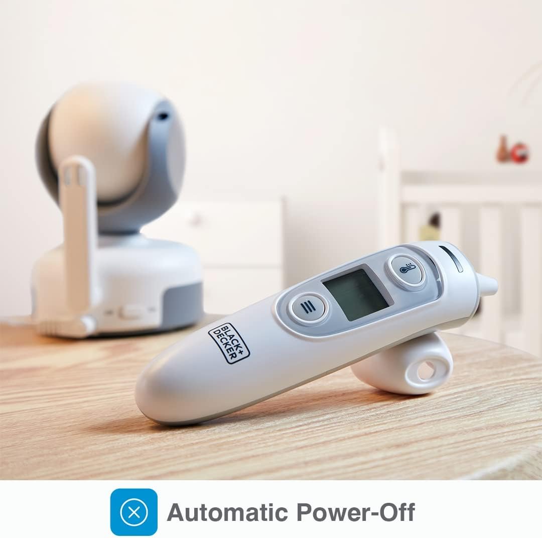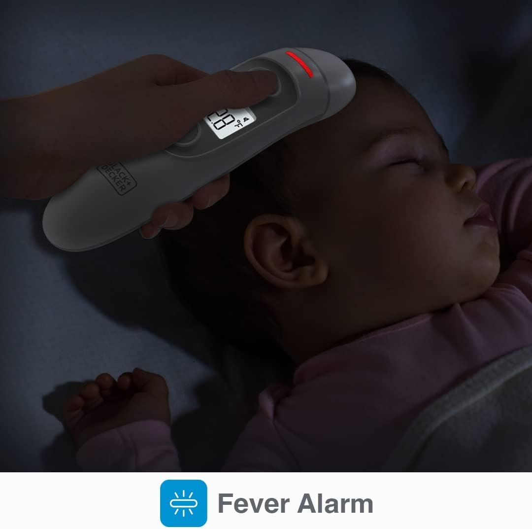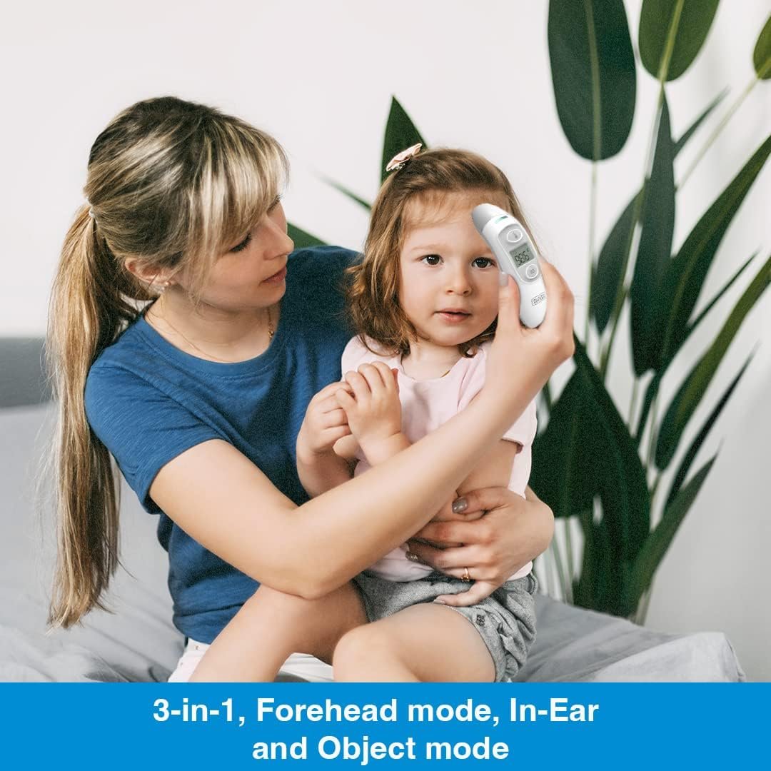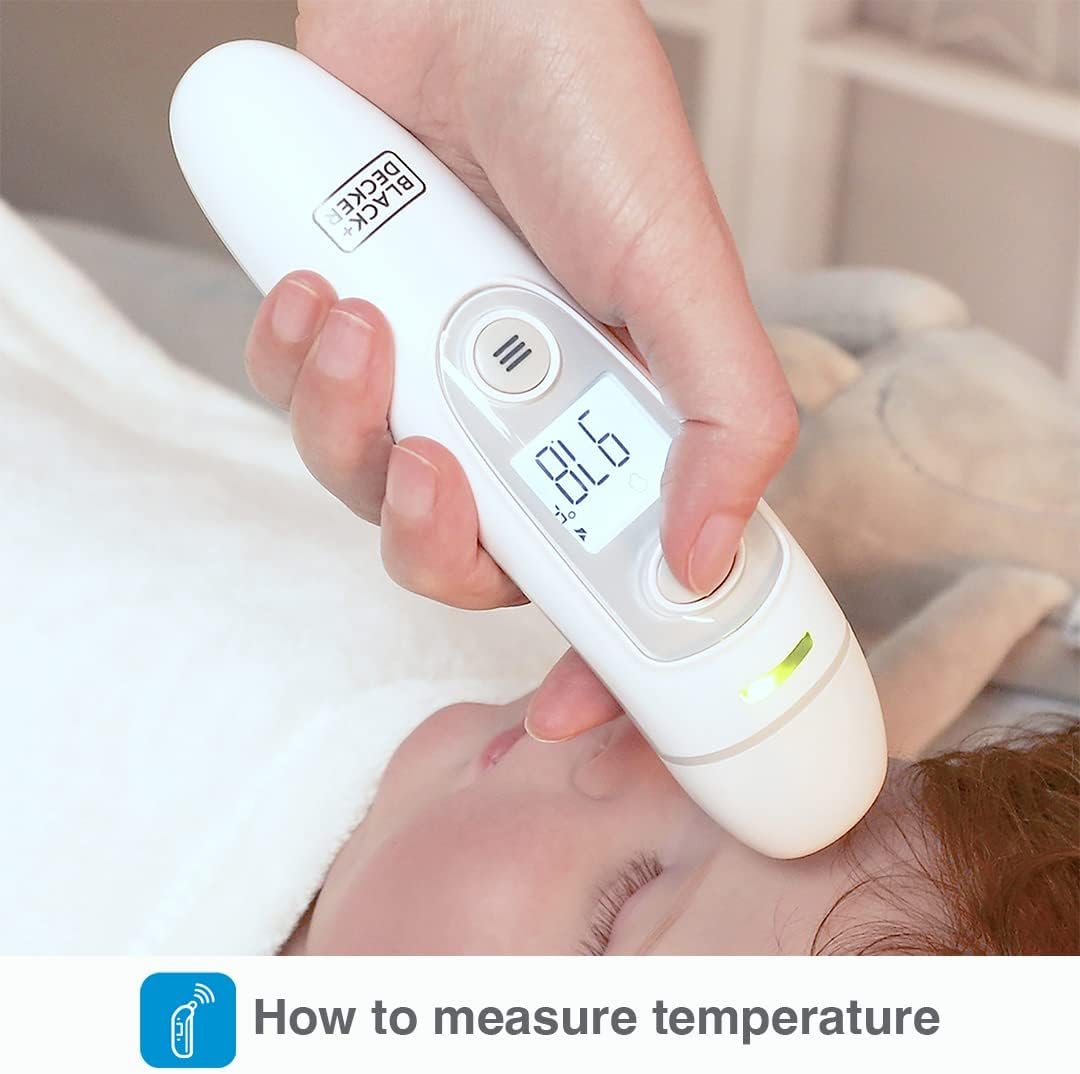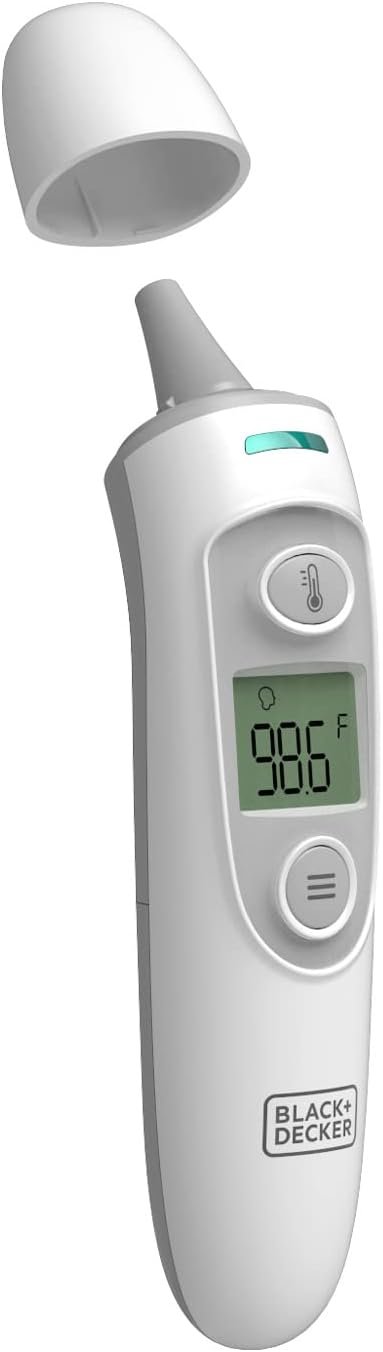 BLACK+DECKER 3-in-1 Infrared Thermometer recommended for babies, suitable for all ages. Ear/Forehead/Object modes. Fast response + accurate: health protection for the whole family. One second temp readings. Large, backlit LCD display. Mute function for silent mode. Store + recall 35 readings. Instant fever detection with color LED indicator. Includes: Thermometer, Pouch, AAA Batteries x2. 3 Year Limited Warranty.