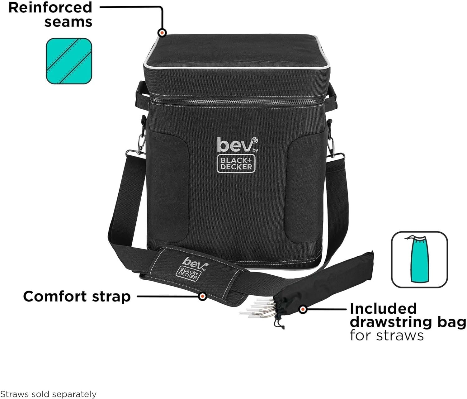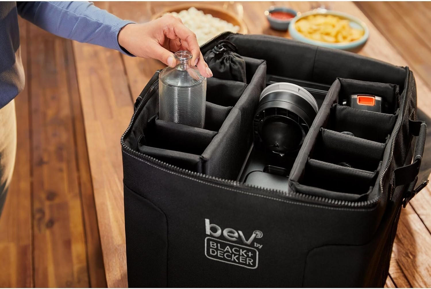 Take the party on the go with the bev by BLACK+DECKER cocktail maker storage bag. It helps protect the cocktail maker in transit and stores your drink essentials. Eight internal pockets hold liquor and glass water bottles, straws, and other bar accessories*. Straps on the interior of the lid hold two 6- or 8-pack boxes of Bartesian capsules*. If you’re taking your personal bartender to a tailgate, party, or on vacation, this storage bag is a must have. 21+ | Please drink responsibly