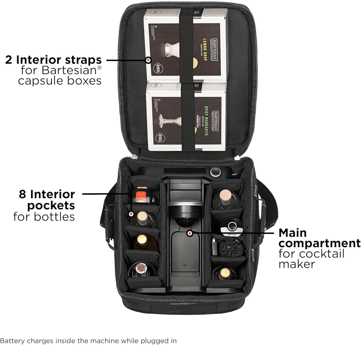 ORGANIZED STORAGE: 8 pockets hold 750ml liquor and the bev by BLACK+DECKER cocktail maker glass water bottles, cocktail maker straws, and other bar accessories, plus the interior straps can hold up to two 8-pack Bartesian capsule boxes*