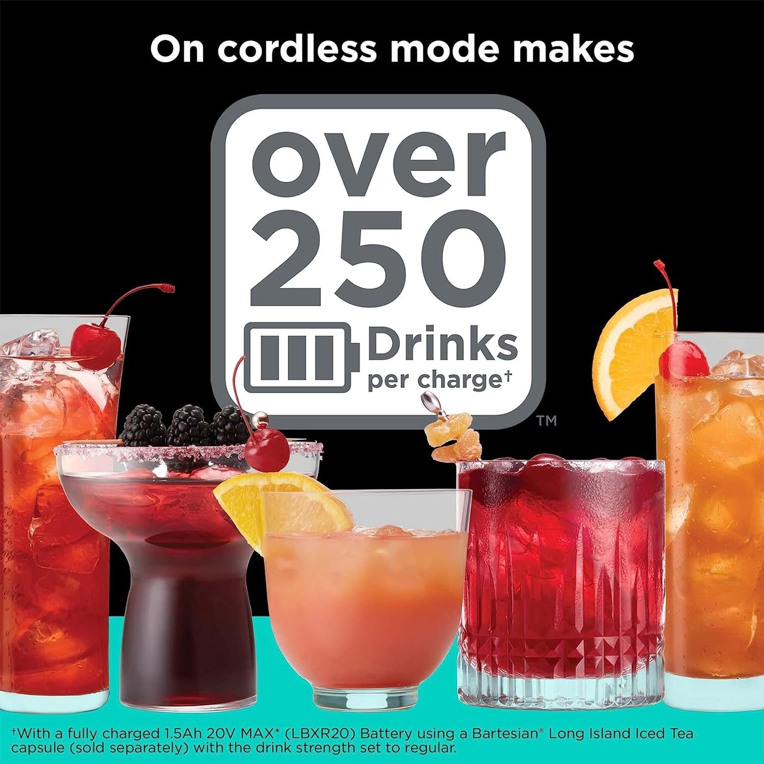 *Maximum initial battery voltage (measured without workload) is 20 volts. Nominal voltage is 18 volts; **Bartesian(R) cocktail capsules sold separately; *** Liquor not included; ****With a fully charged 20V MAX* 1.5Ah battery (LBXR20 included) using a Bartesian(R) Long Island Iced Tea capsule (sold separately) with the drink strength set to regular.