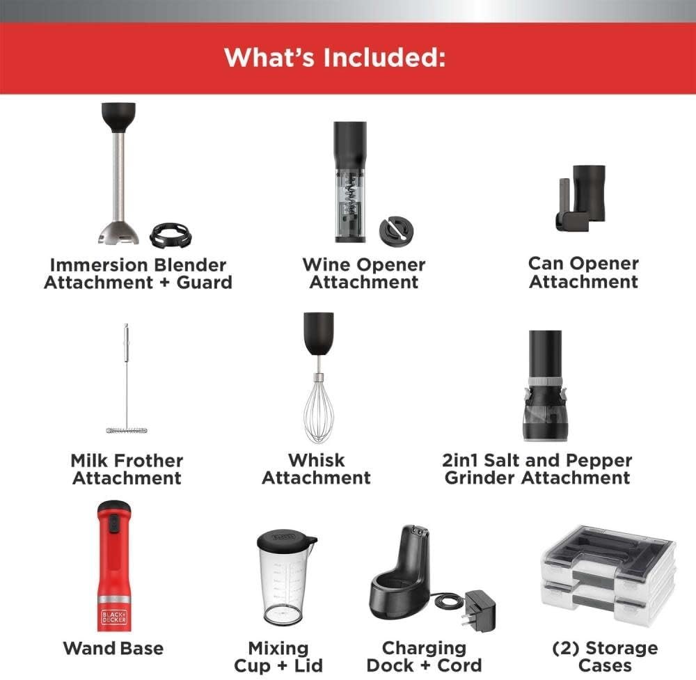 MULTIFUNCTIONAL: The ultimate kitchen sidekick, the BLACK+DECKER kitchen wand system is there to help you with a variety of cooking and food prep applications. Blend, whisk, froth, and more with the 6 included attachments.