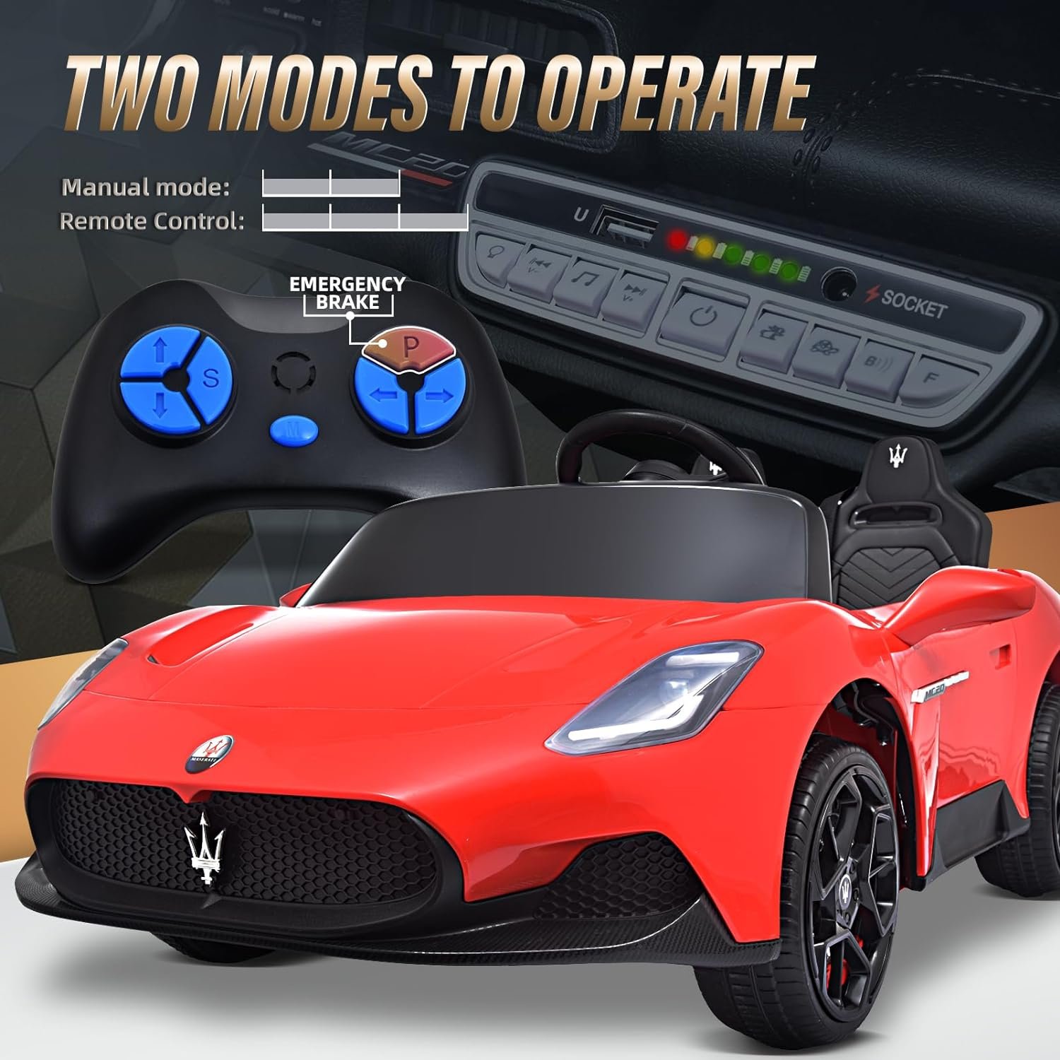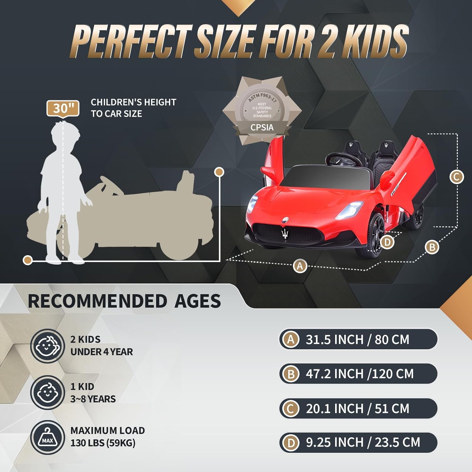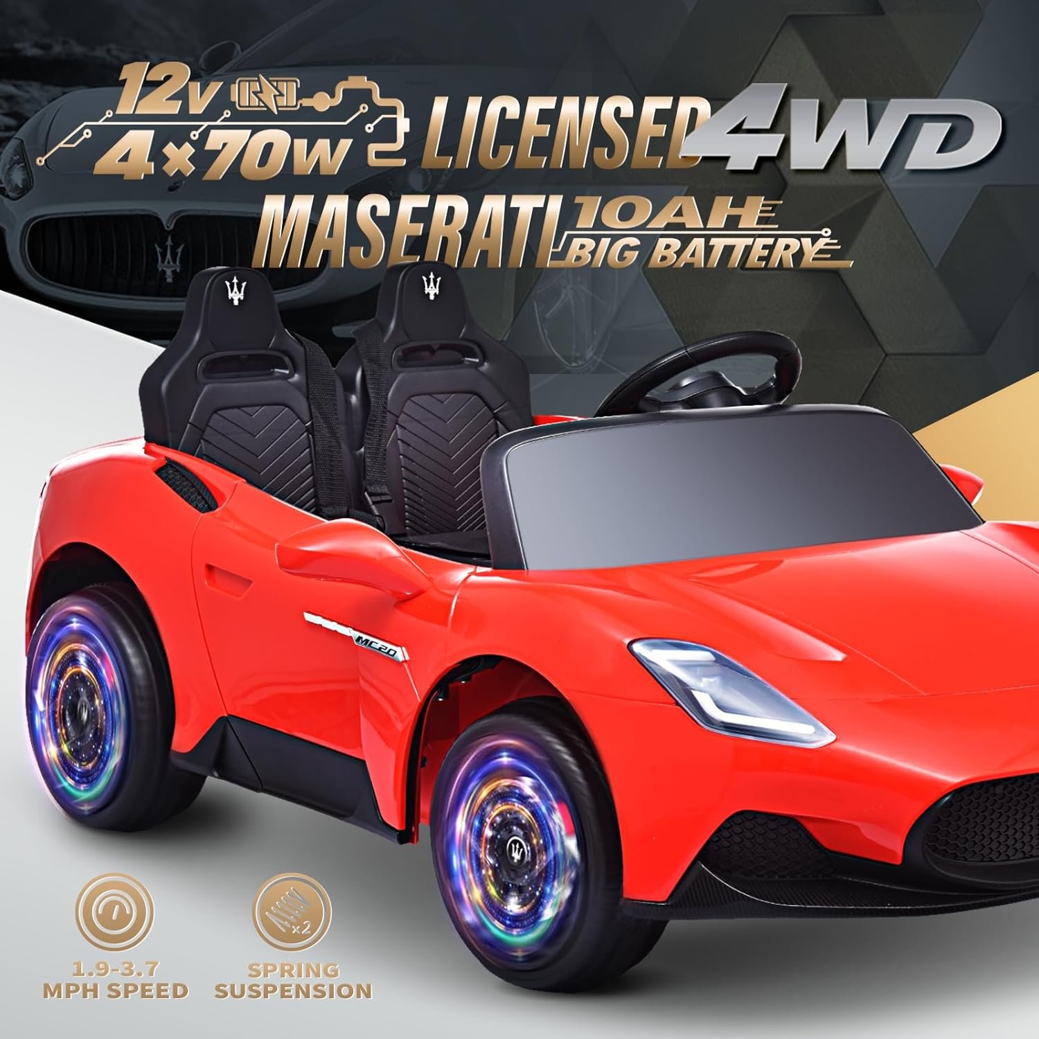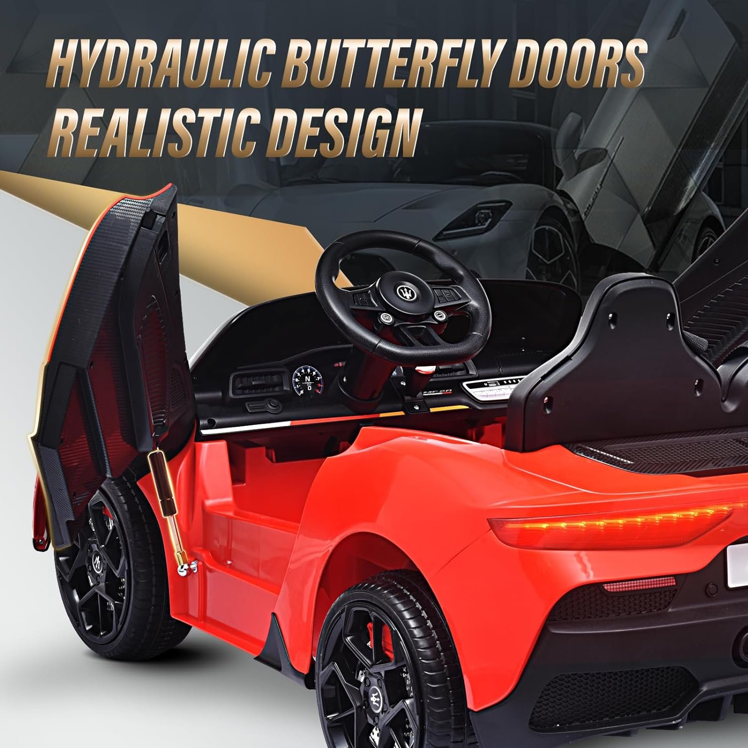 šćLicensed Maserati MC20 Realistic 2-Seater CarćThis ride-on with a 19-inch seat and two independent safety belts, the maximum weight capacity can reach up to 130 pounds, designed specifically for two kids under the age of 4 or a 7 or 8-year-old child. Like the real Maserati MC20, this ride-on features realistic lockable hydraulic scissor doors that elegantly open up like a butterfly, providing a real driving experience for your kids.