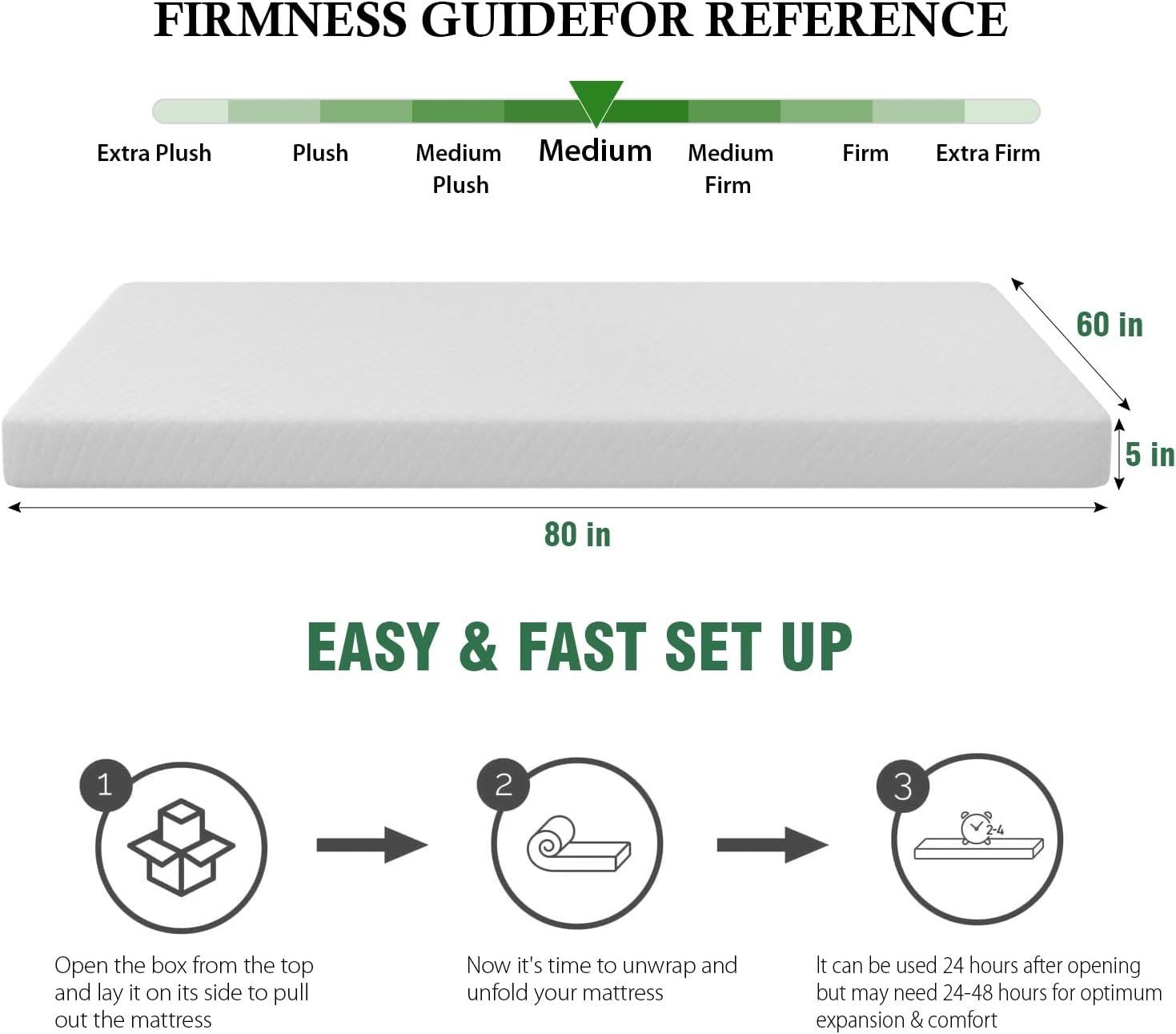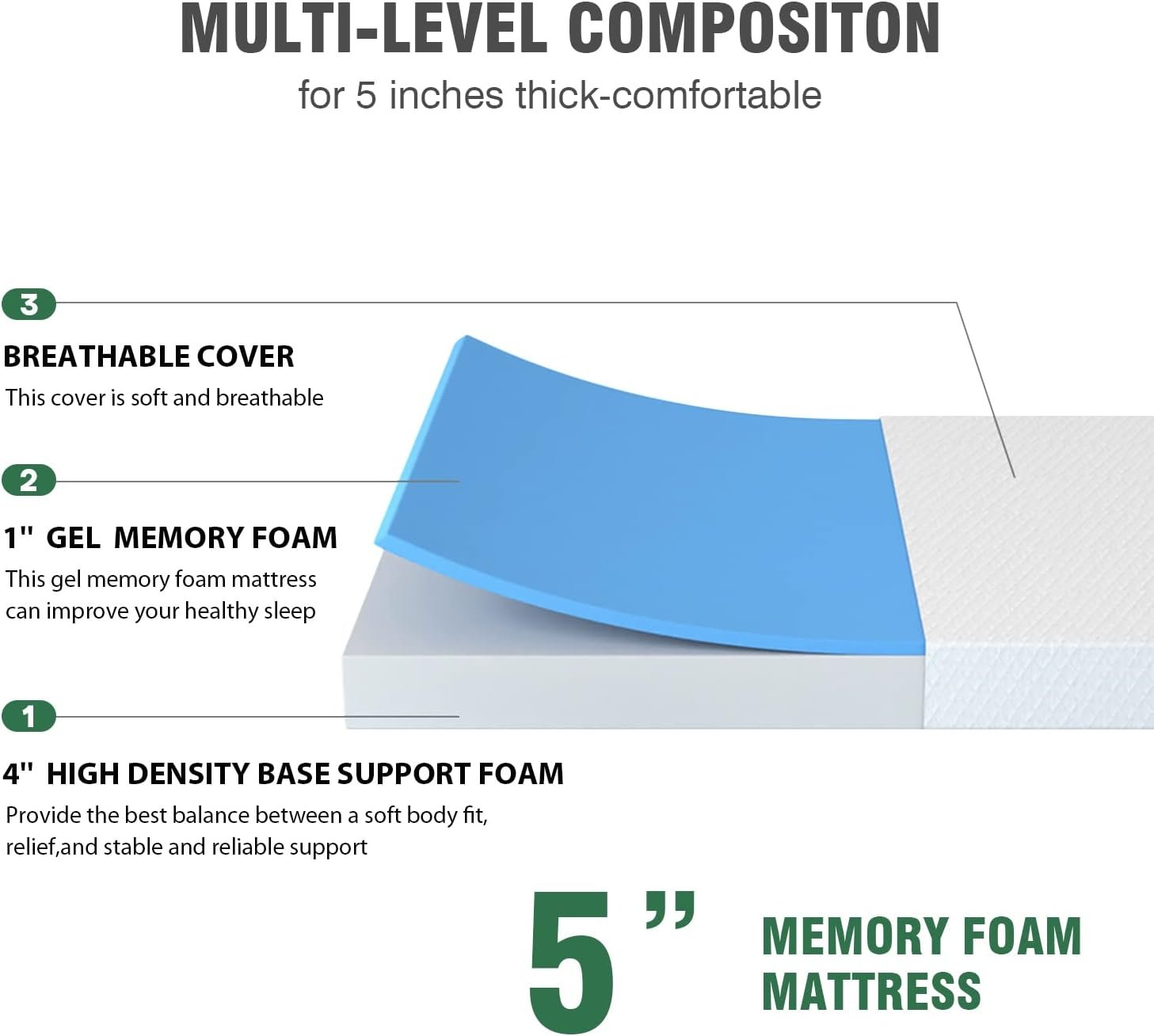 【Double Layer Construction】The thick mattress is made up of 1″ gel memory foam and 4″ high density support foam. The memory foam conforms perfectly to your body for a softer sleep, while the high-density support foam makes the thick mattress more supportive and prevents the mattress from collapsing, so your mattress will last for many years to come.
