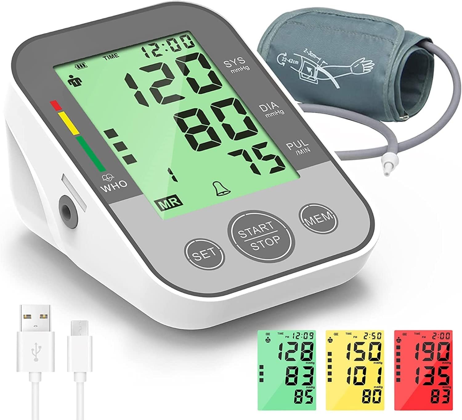✅ 【Large Three-color Backlit Screen】: Large 3.4 inch LCD display with clear oversized numbers, which allows you to easily read your blood pressure and heart rate in real time. The three-color (green / yellow / red) backlit design display indicates if your blood pressure reading is optimal. It can be read clearly even in the dark. Blood pressure below 140mmHg (normal) is green, 140-180mmHg (mild to moderate hypertension) is pale yellow, and above 180mmHg (severe hypertension) is red.