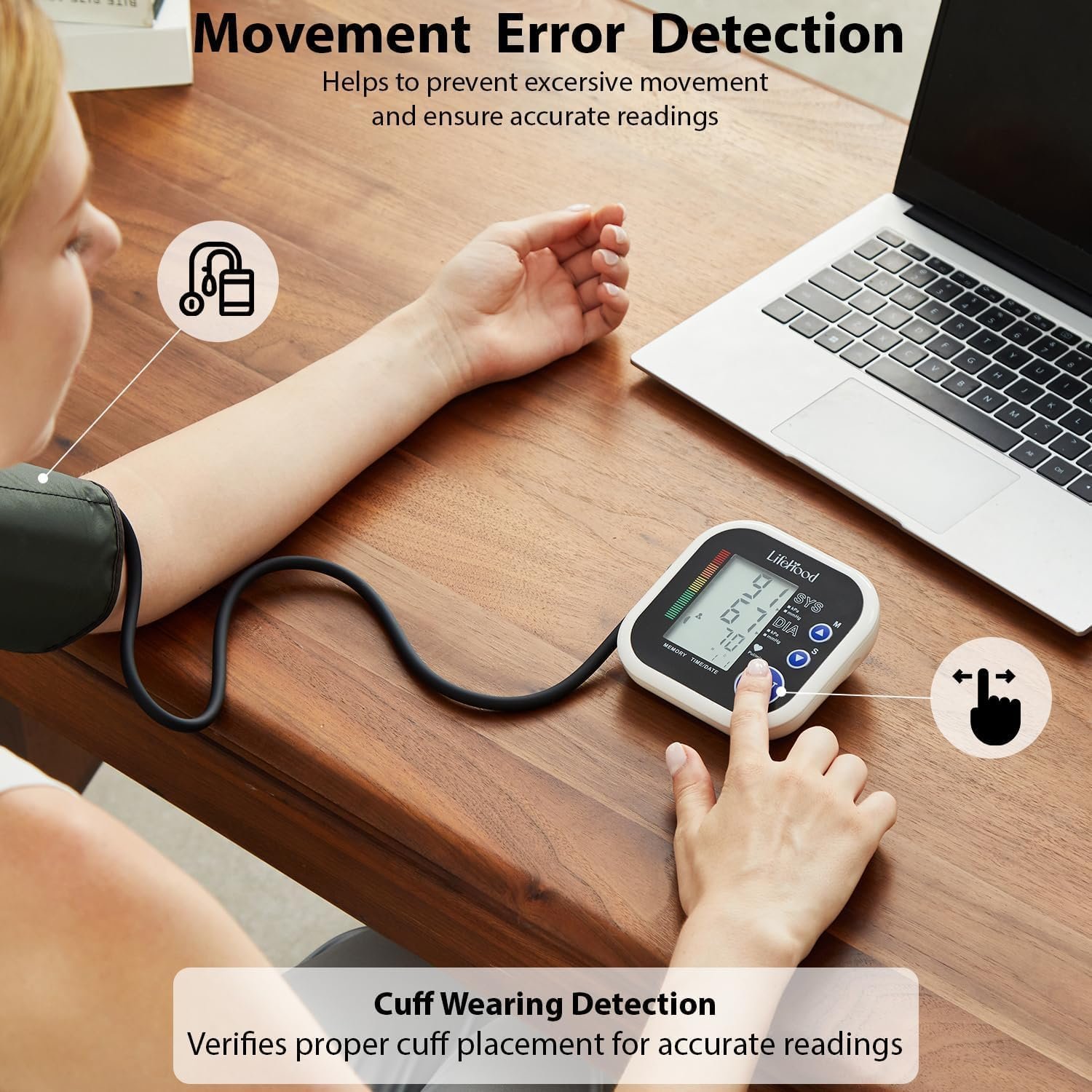COMPREHENSIVE BP MONITOR INDICATORS: Experience comprehensive health monitoring with our advanced blood pressure cuff, equipped with a built-in excessive body motion detector, cuff wrap indicator, and irregular heartbeat detector, while low voltage, fault reminders, and automatic shutdown enhance usability and add convenience.