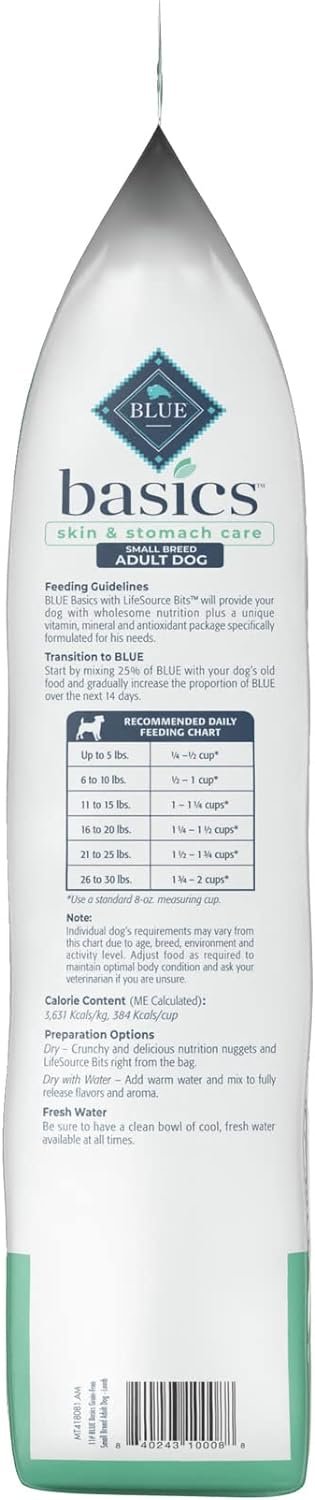 LIMITED INGREDIENT DOG FOOD: BLUE Basics doesn’t contain any chicken, beef, corn, wheat, soy, dairy or eggs making it a good option for dogs with food sensitivities; It’s small bite kibble and balance of carbohydrates and protein meet small breed’s needs