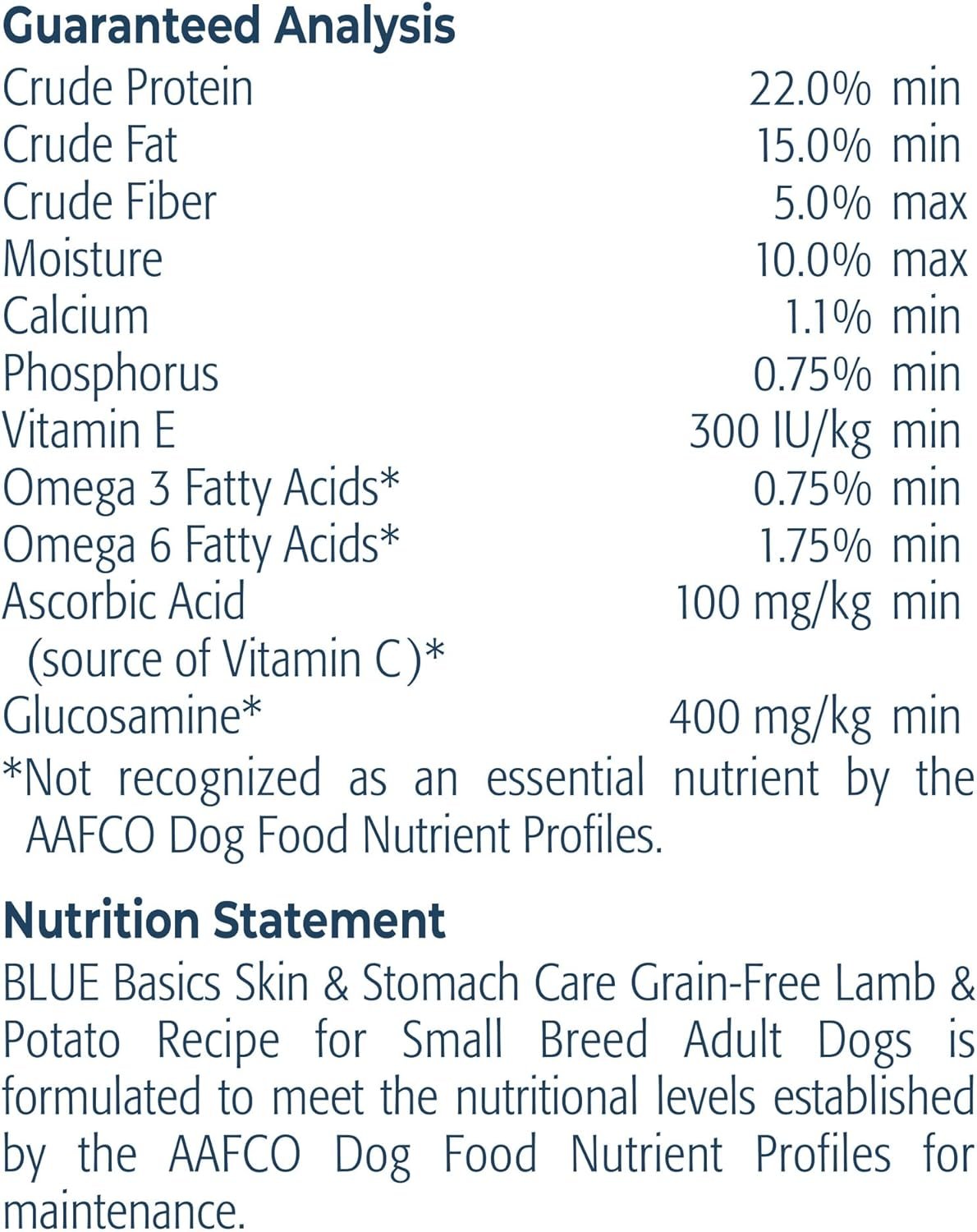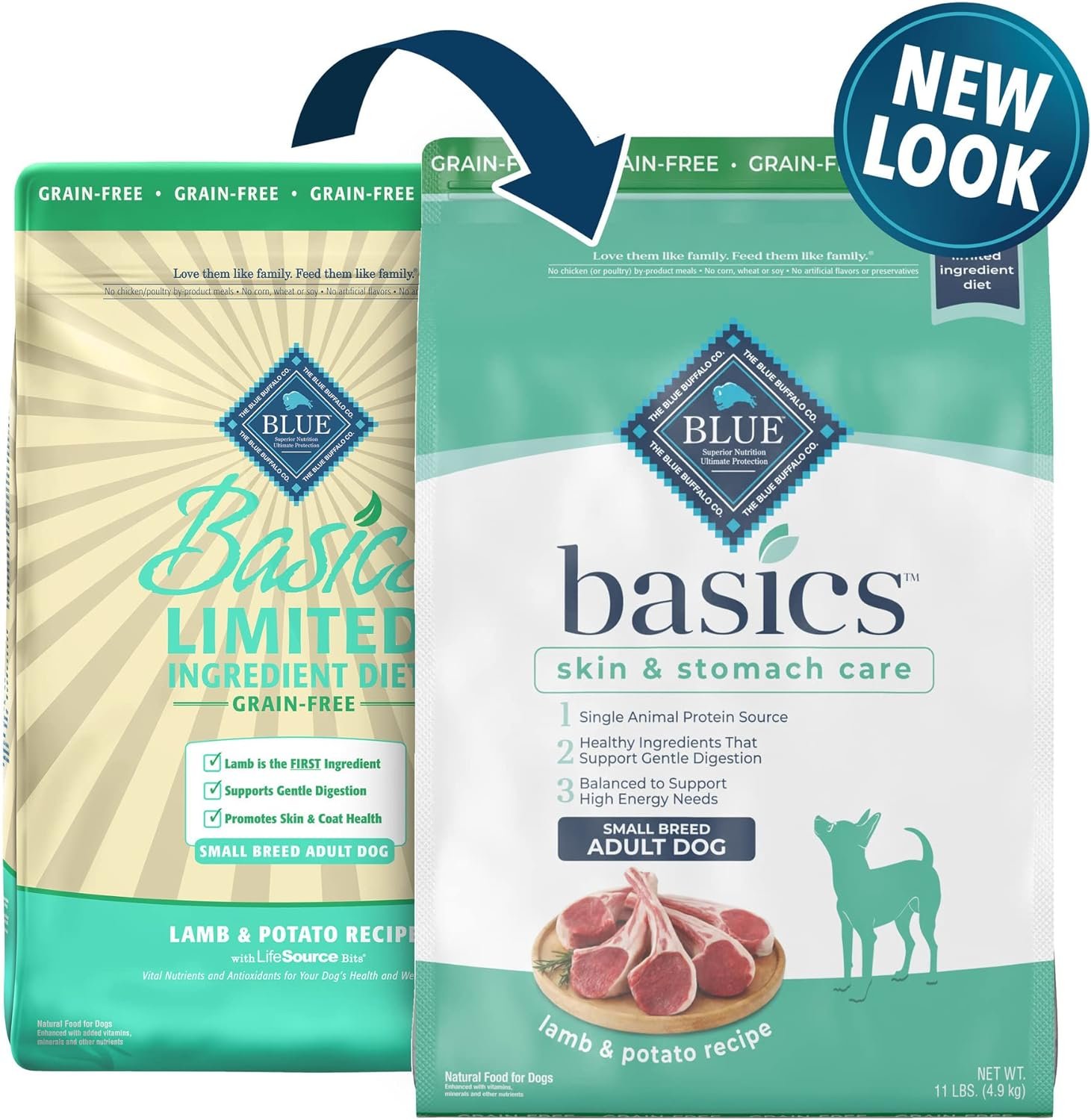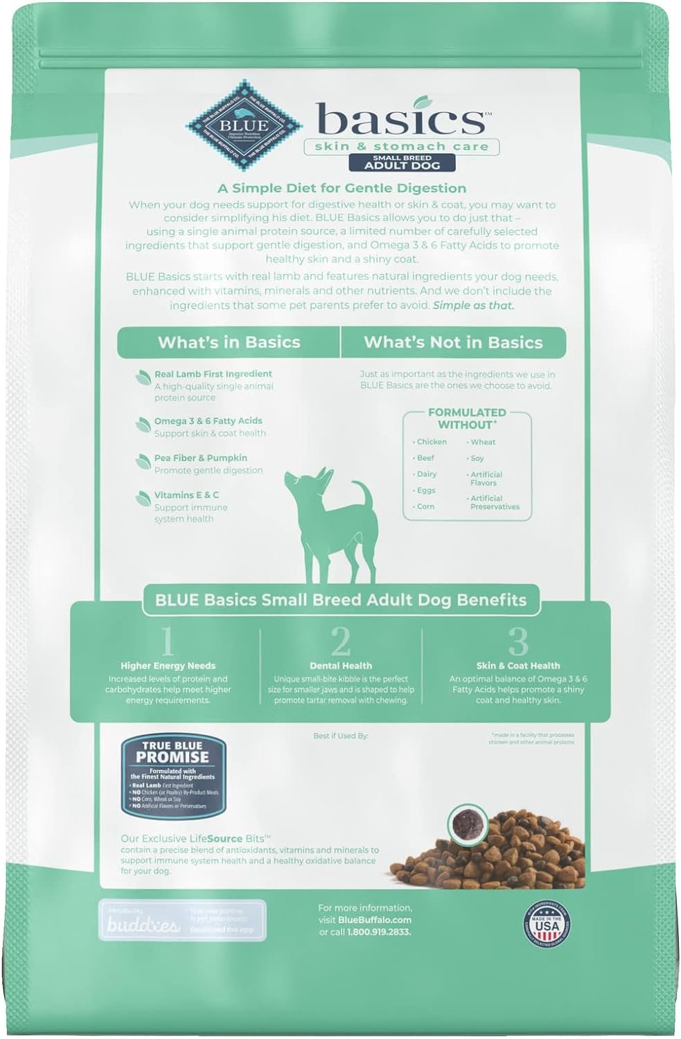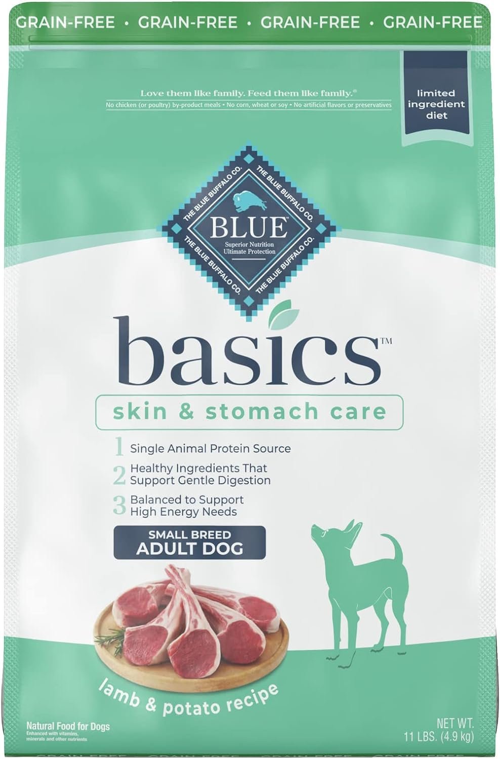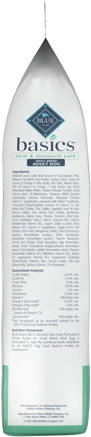 Contains one (1) 11lb bag of BLUE Basics Skin & Stomach Care, Grain Free Natural Adult Small Breed Dry Dog Food, Lamb & Potato