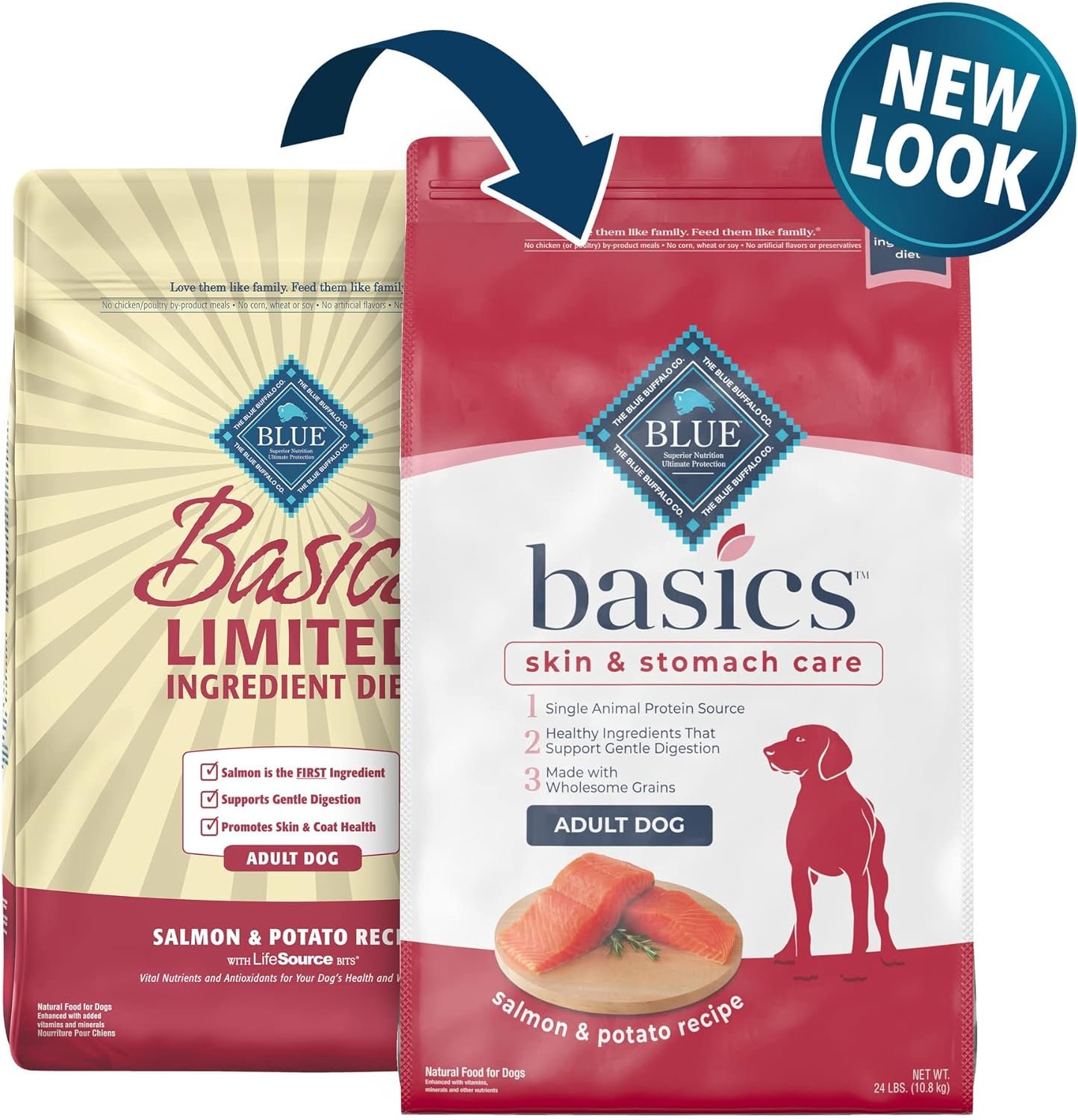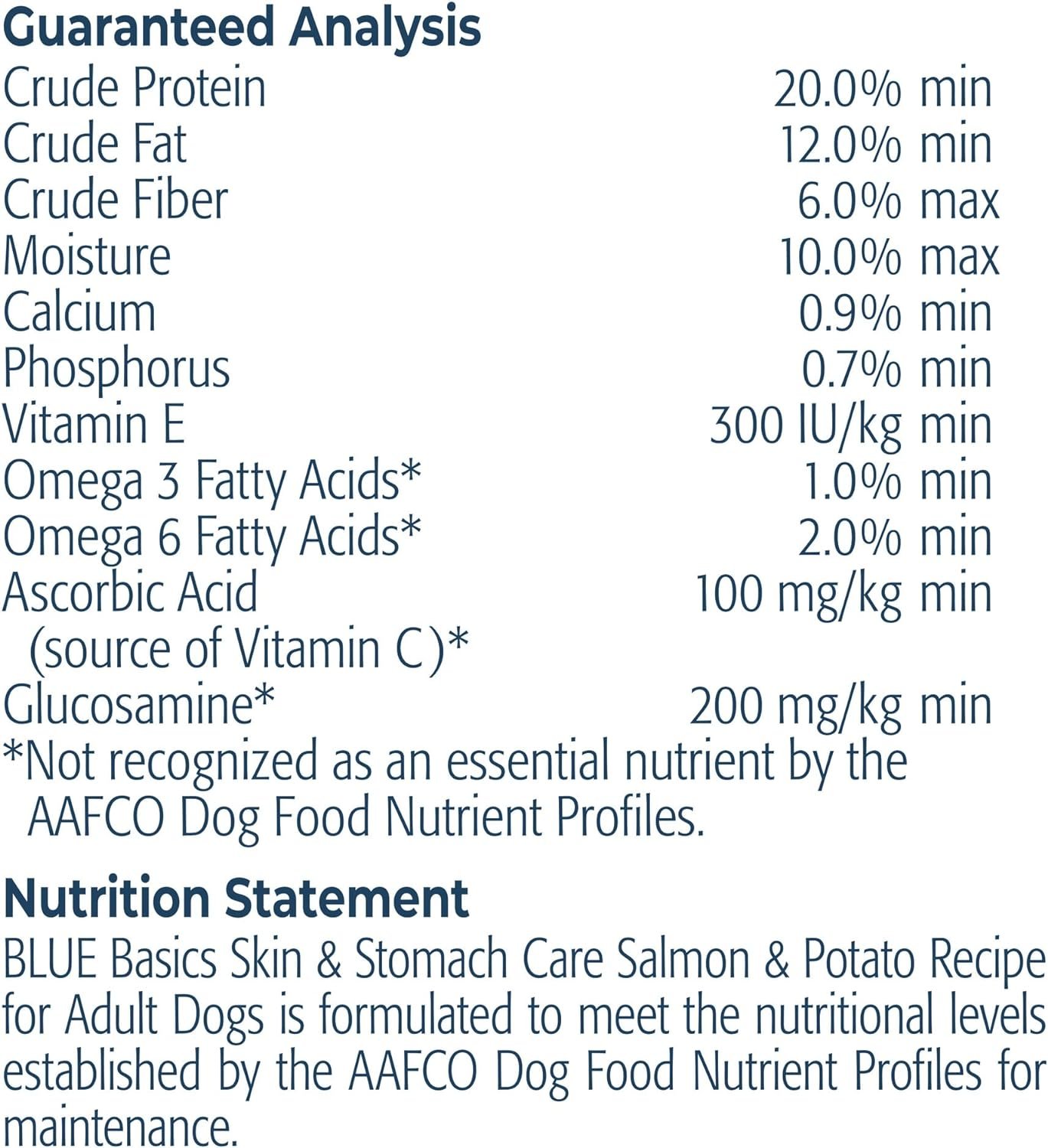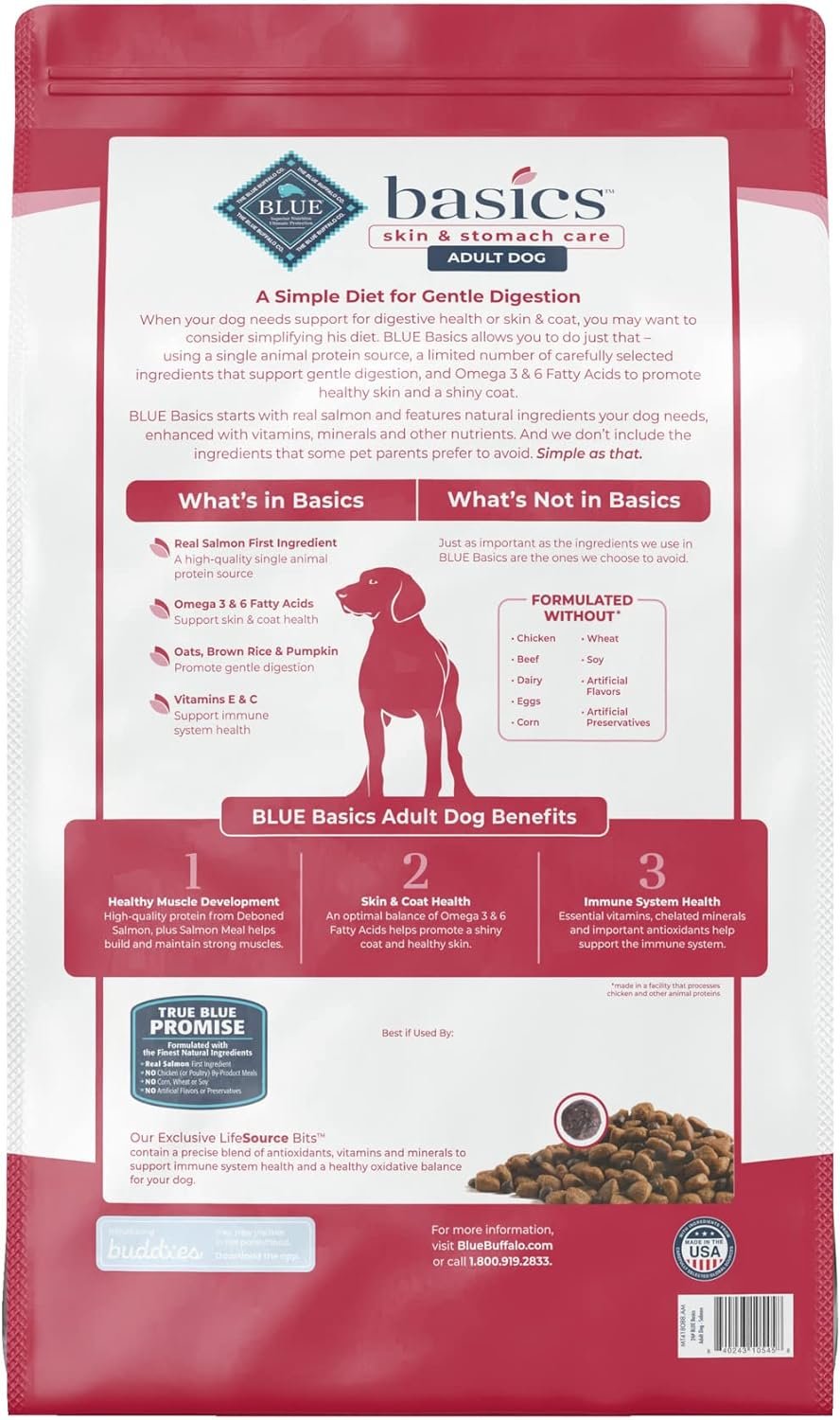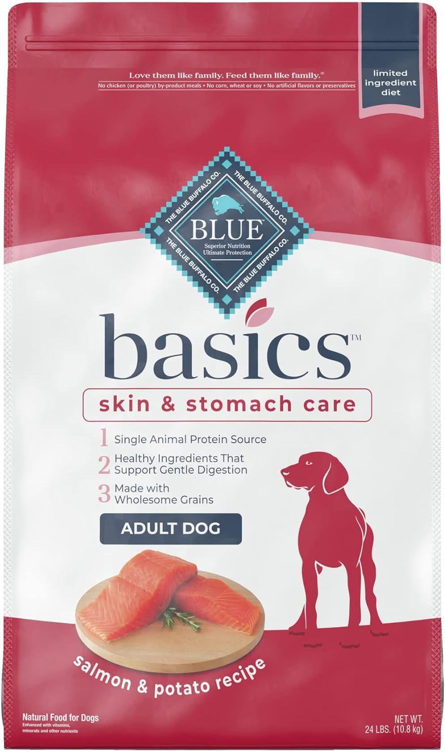 Contains one (1) 24lb bag of BLUE Basics Skin & Stomach Care, Natural Adult Dry Dog Food, Salmon & Potato