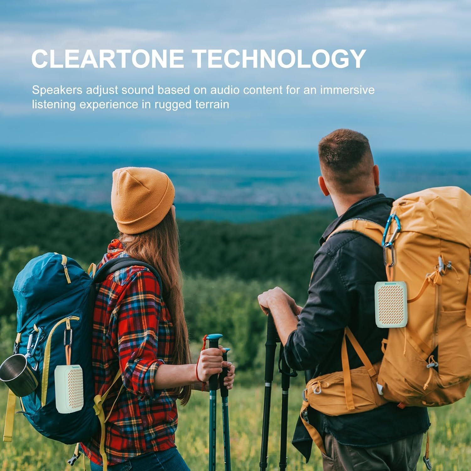 12H Long Lasting: This outdoor speakers with clip has a built-in 1800mAh rechargeable cell that lasts up to a day on a single charge, twice as long as similar speakers. With a max playtime of 12 hours (Various on volume level and audio content), mini speaker can be a sound enhancer for any of your Bluetooth devices. Two-Way Audio Transmission Technology ensures a stable connection. No need to worry about disconnection while biking or hiking.