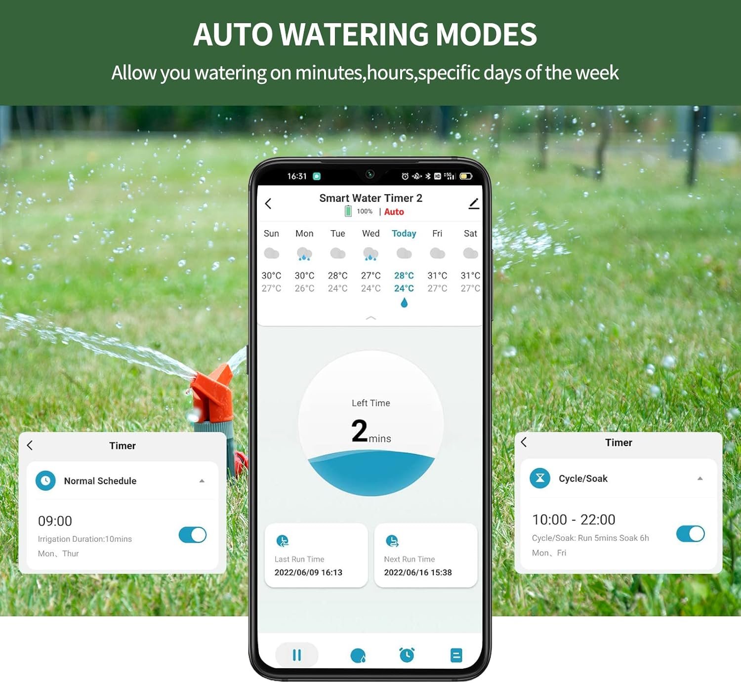 The watering timer has three watering modes: Automatic watering, rain delay watering, manual watering, you can according to your needs to set the program on the Smart Life APP, the system will automatically execute according to your choice.