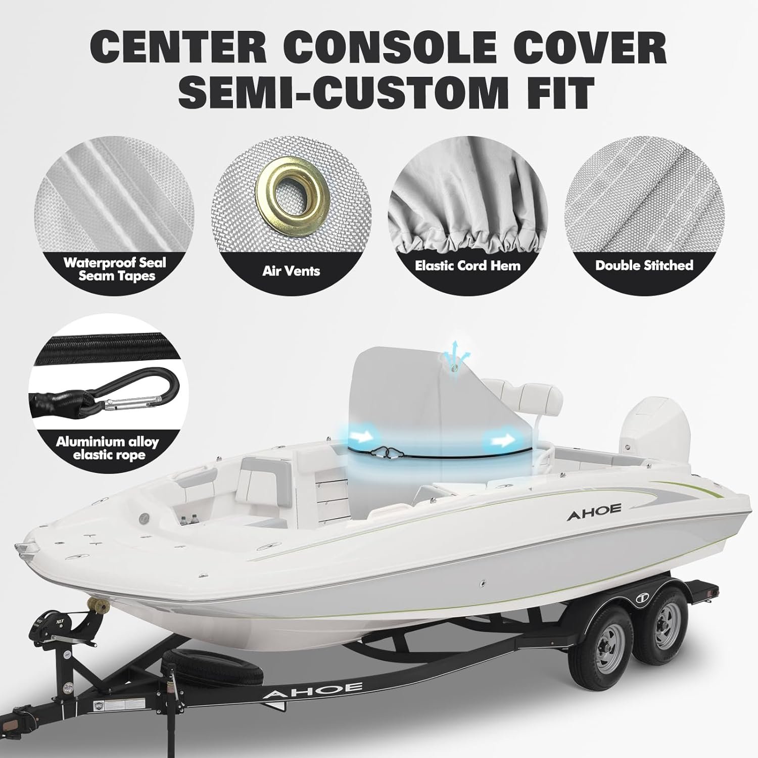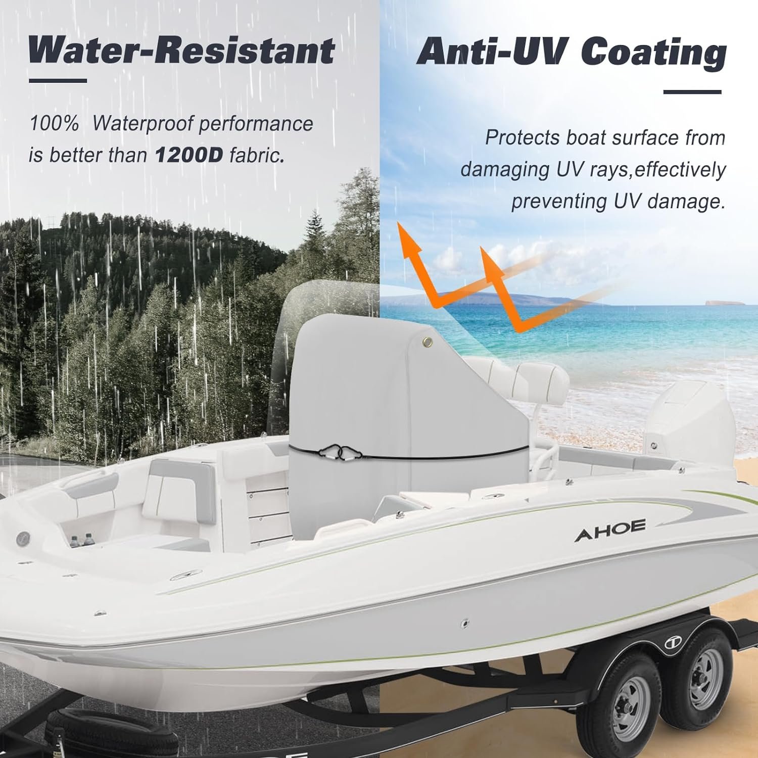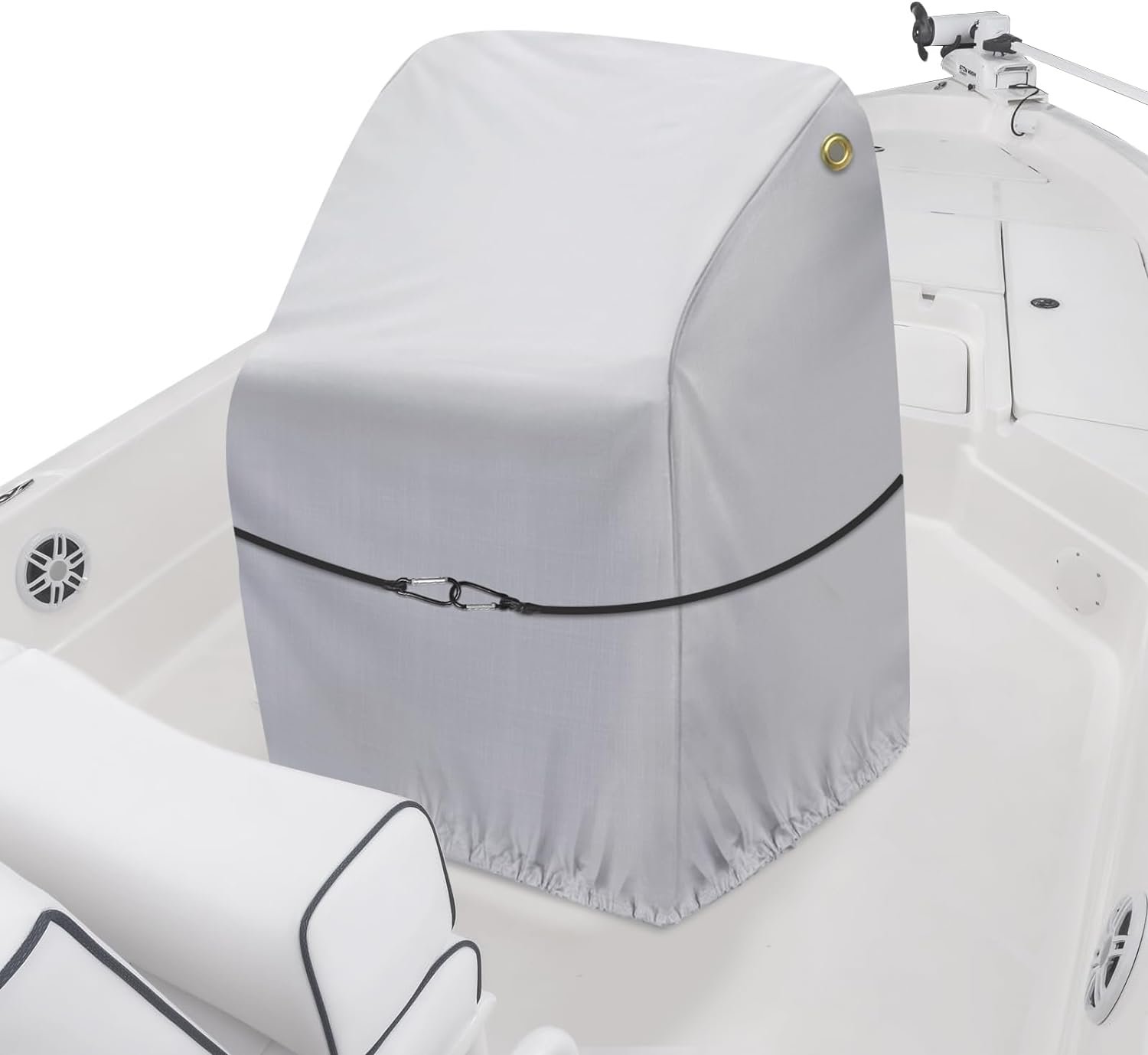⚓【Fixed Windproof】To cope with severe weather such as high winds, our center console cover is specially designed with a heavy-duty elastic cord hem on the cover bottom for fixing, instead of a traditional thin drawstring which is easy to be weathered. It is also equipped with one separate strong elastic rope that can firmly fix the cover to the center console Waist Position, preventing it from being blown away when mooring or Trailerable.