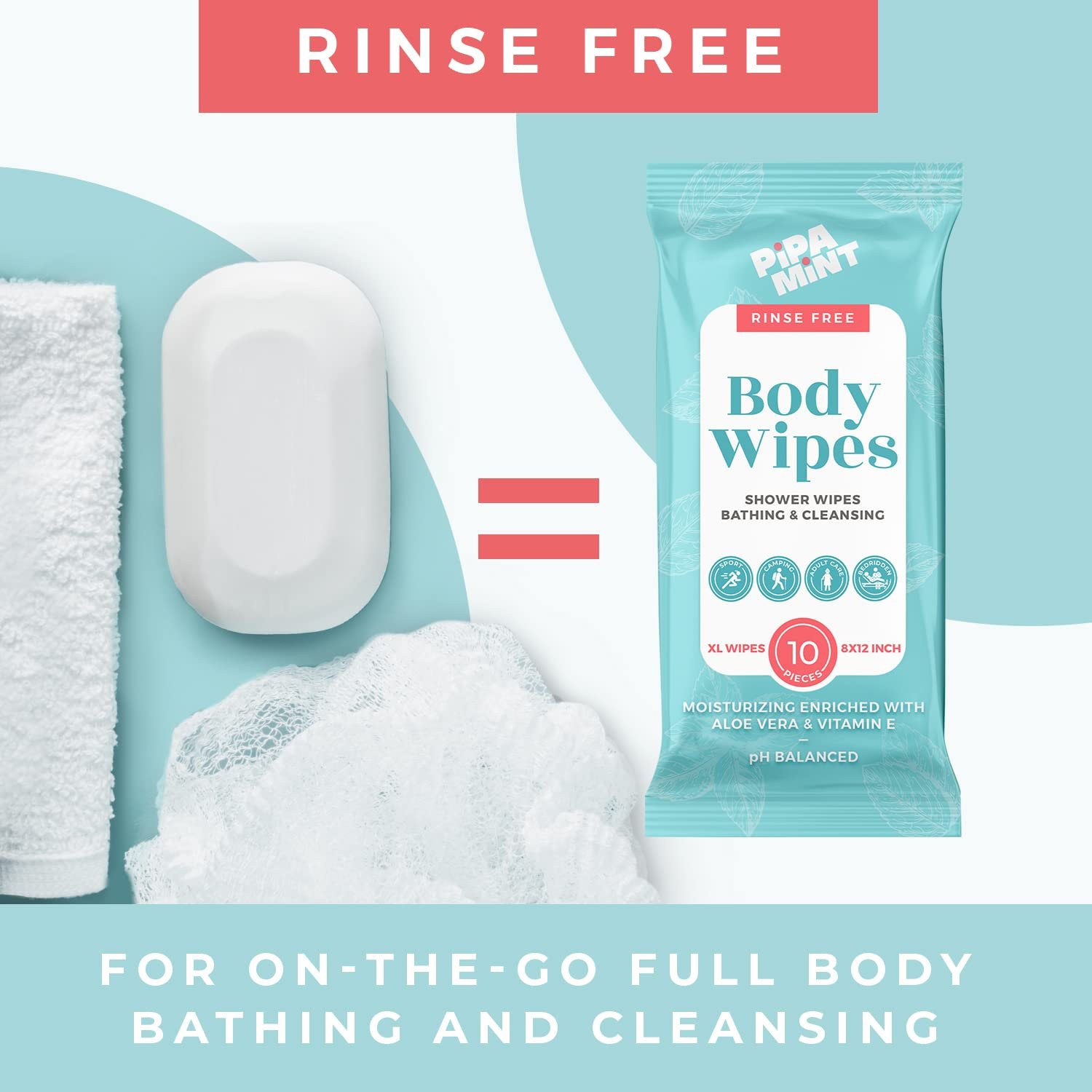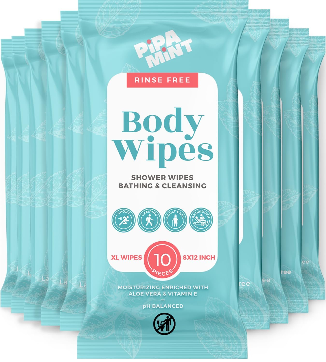Portable – Easy to carry: quick cleaning with PIPA MINT wet wipes for adults you will feel all fresh again. No need to feel bad or afraid to sweat, a super easy solution in the exact size for your convenience: non-sticky residue after use. Full Body wipes is A MUST HAVE in your purse or bag – Rinse Free No Water, shower wipes anytime, anywhere: Camping, Travel, Gym, After Workout.
