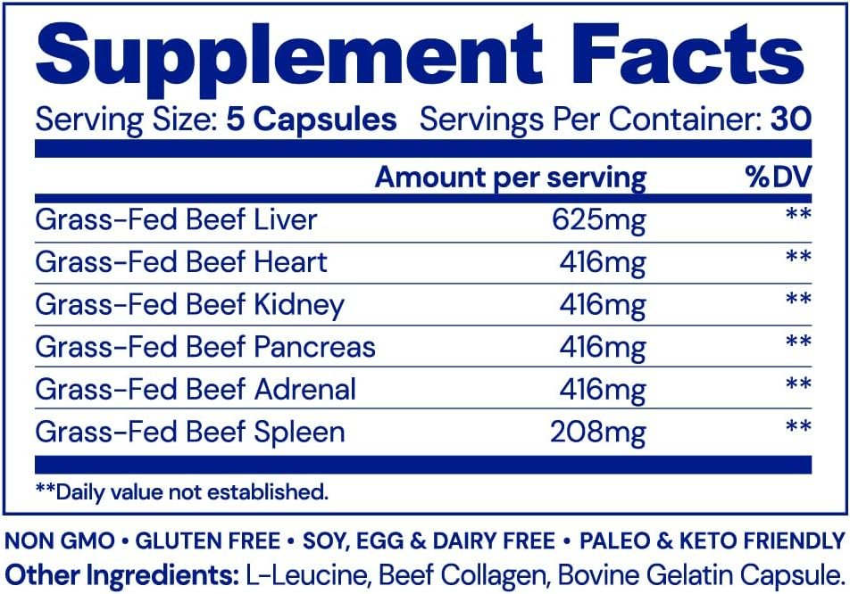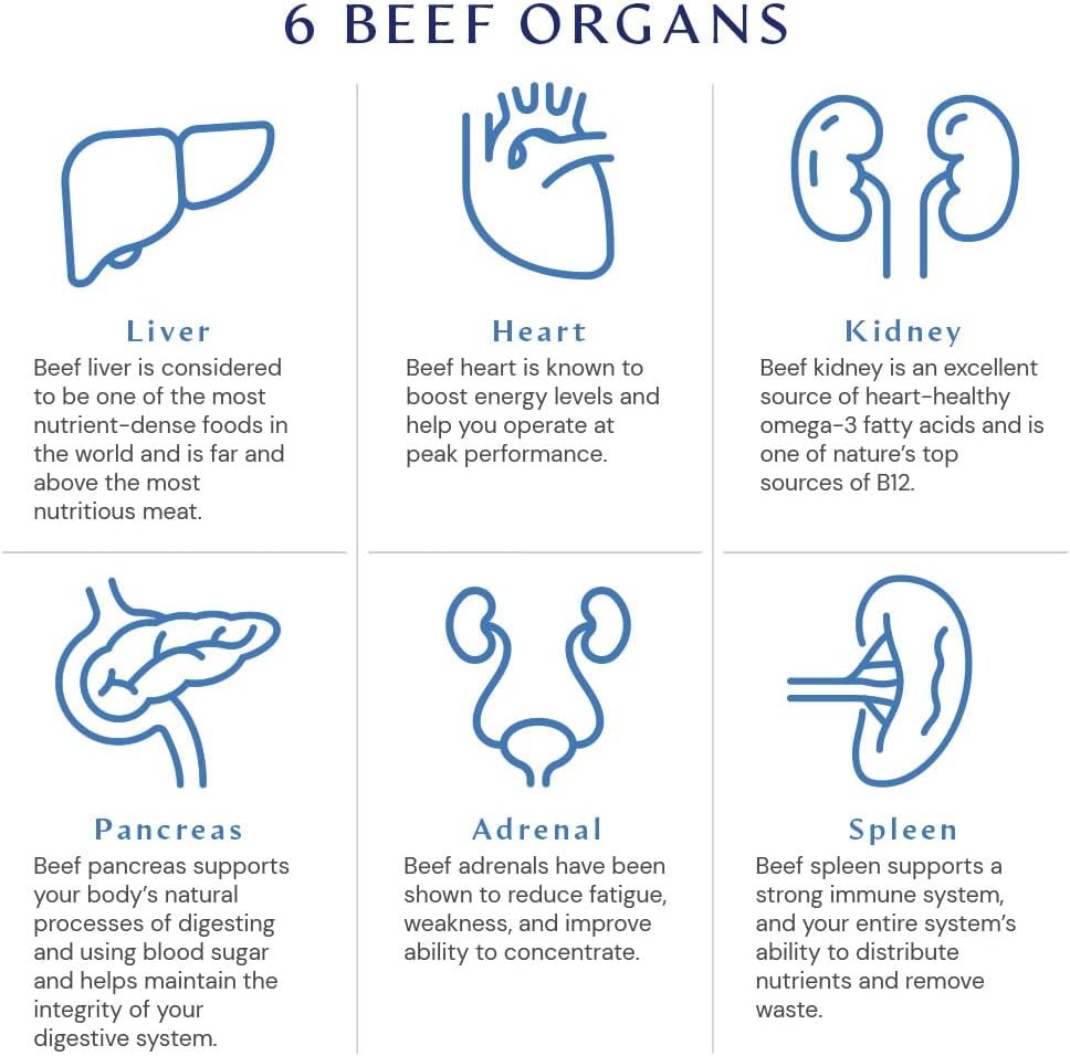 6 OF NATURES MOST POWER-PACKED SUPERFOODS. Our grass fed beef liver organs supplement contains 625mg Grassfed Beef Liver, 416mg Grassfed Beef Heart, 416mg Grassfed Beef Kidney, 416mg Grassfed Beef Pancreas, 416mg Grassfed Adrenal, 208mg Grassfed Beef Spleen