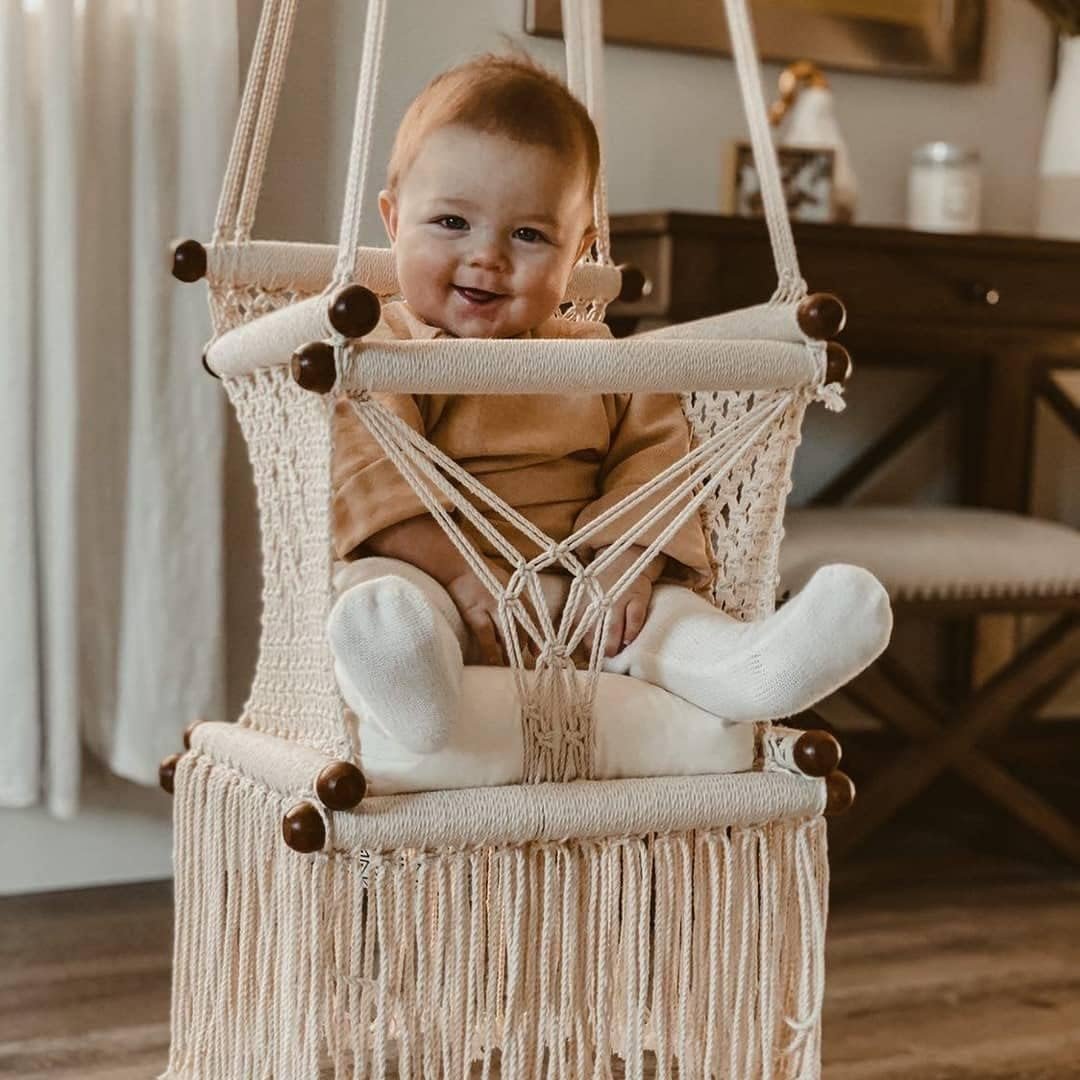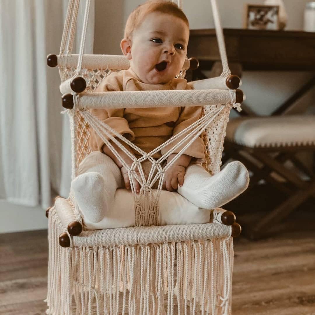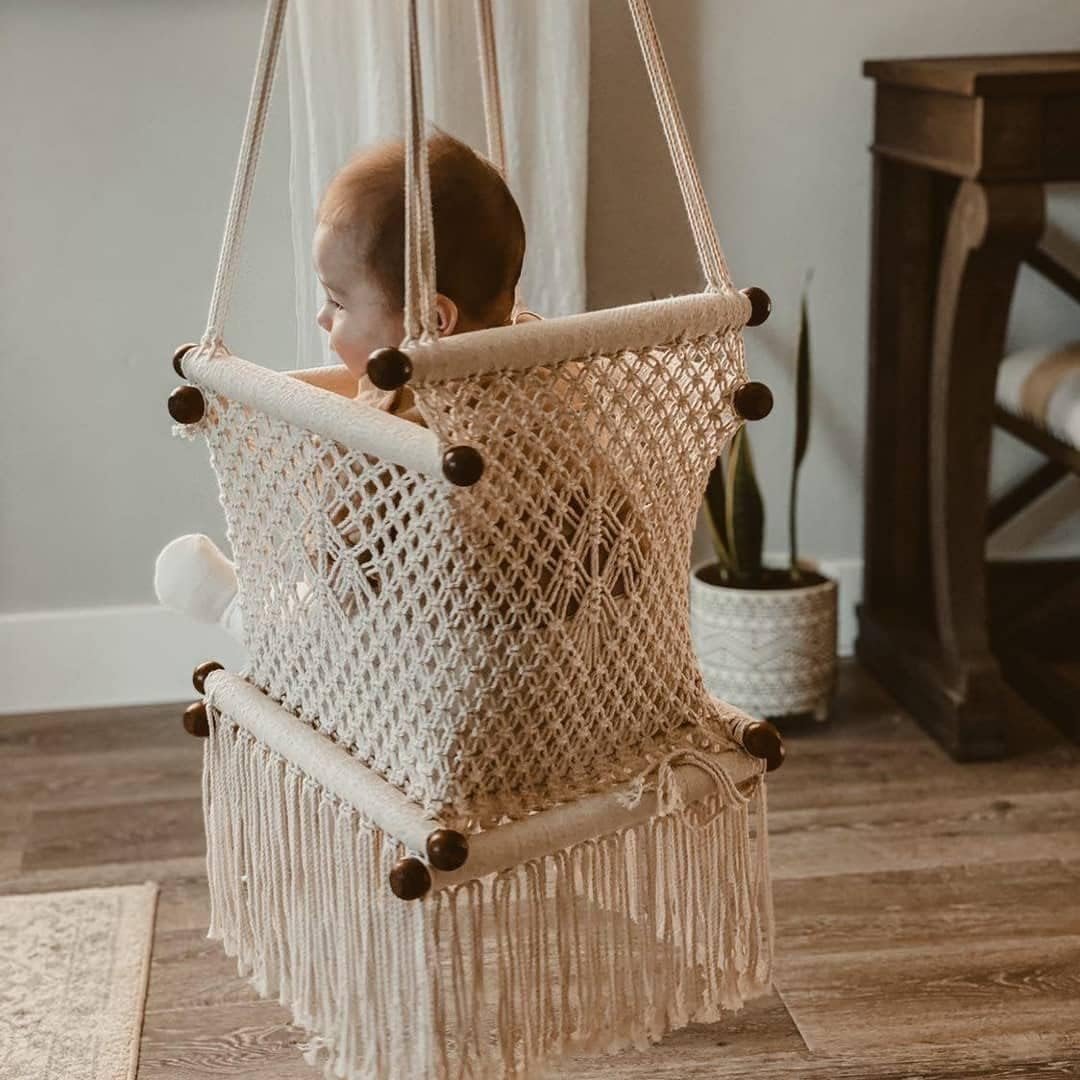 Baby swing chair made in macrame. Perfect for gift or photographs with your baby. This baby chair swing is very soft and comfortable, easy to carry needs little space and is a beautiful decorative element, try it and we are sure it will become your favorite chair. Can be a great gift for any occasion. Ready for indoor and outdoor use. wholesale available please contact us for details MADE IN INDIA
