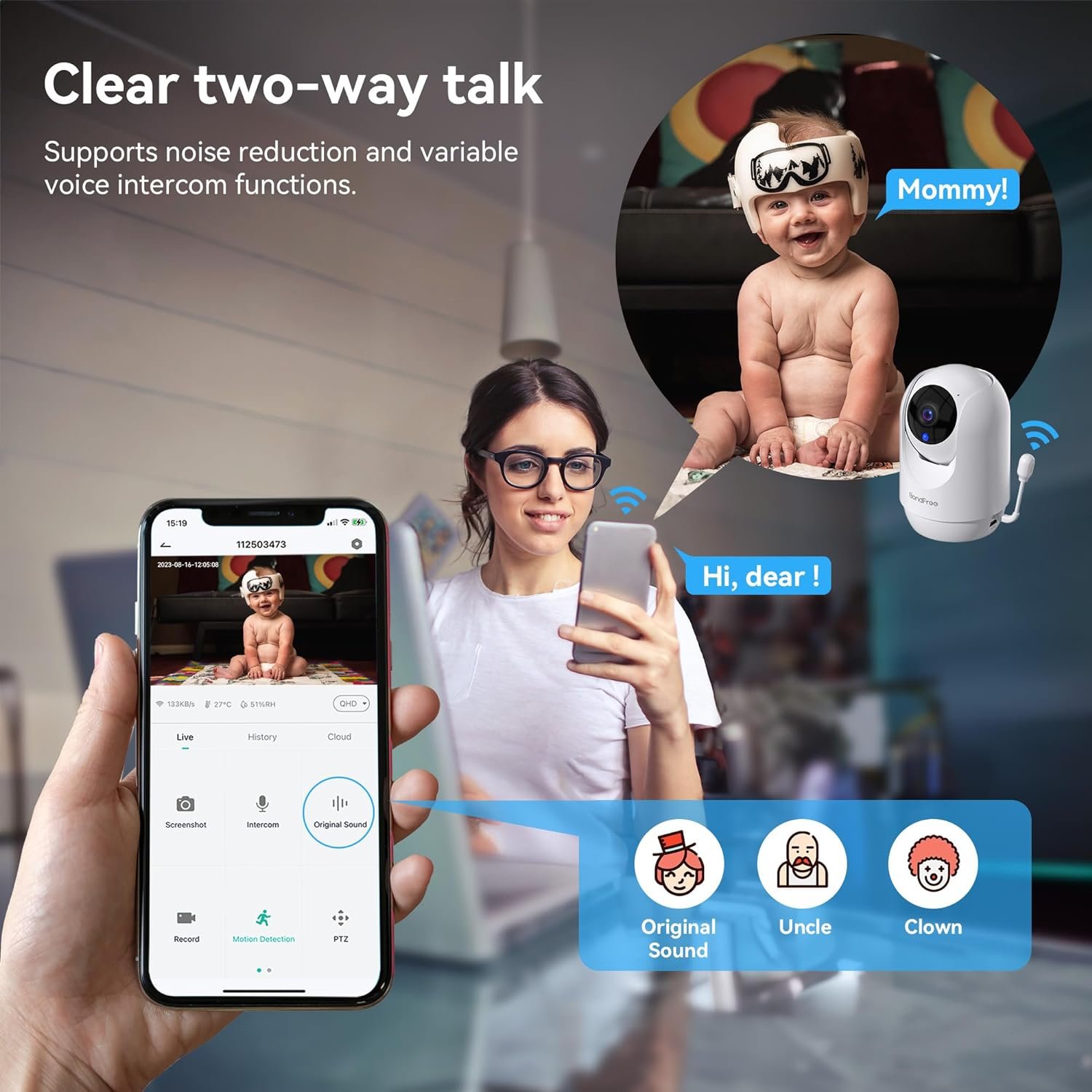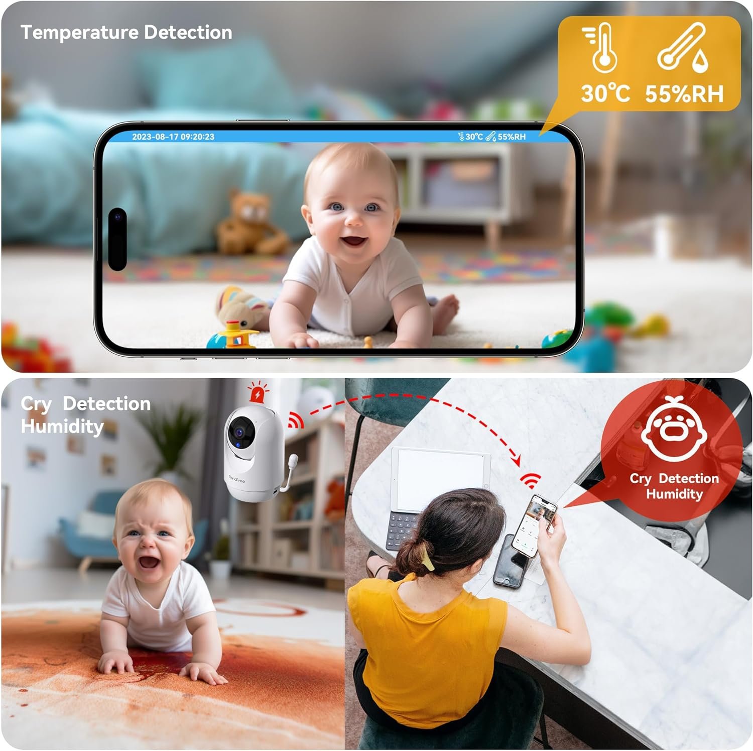 Baby monitor with cry, motion, temperature/humidity detection and sound noise reductionas,alerting you of your baby’s status