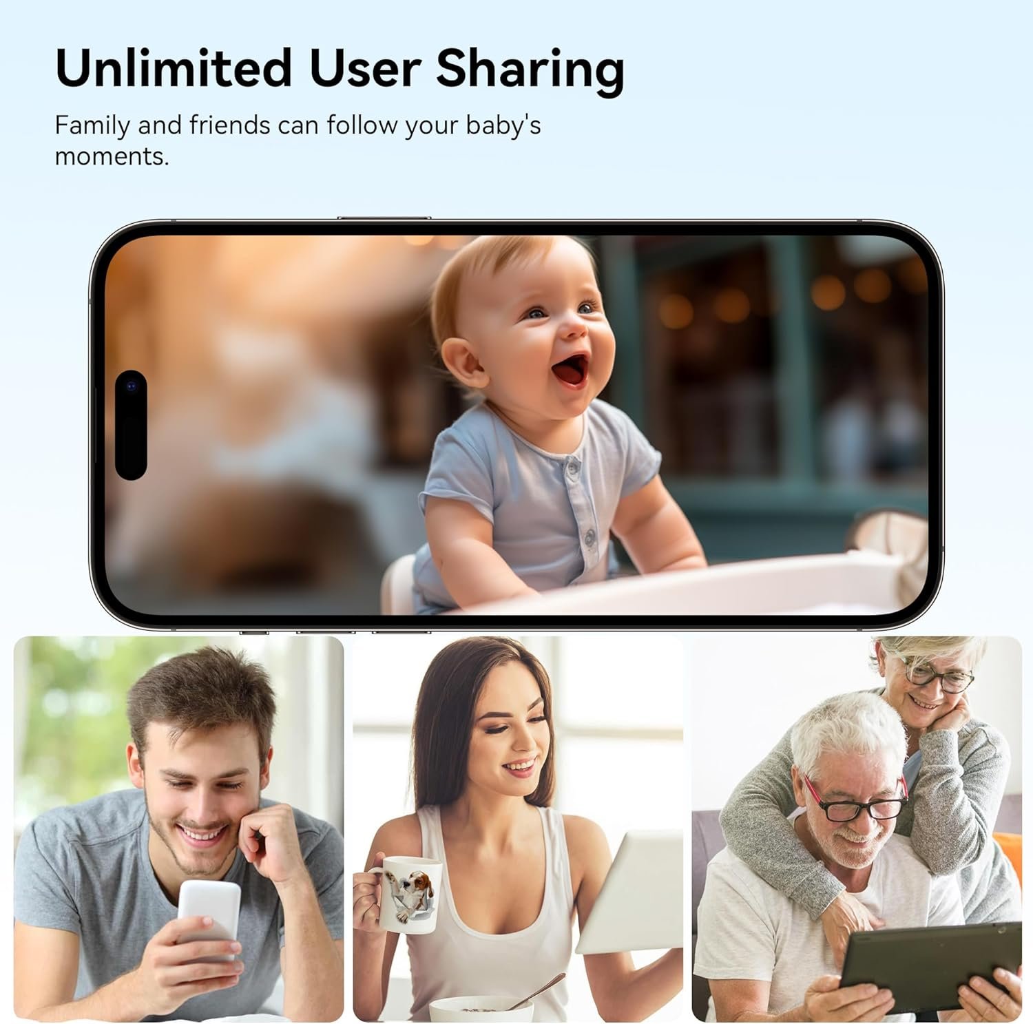 The baby monitor can be shared by unlimited users, and family and friends can follow the baby’s growth through their phones