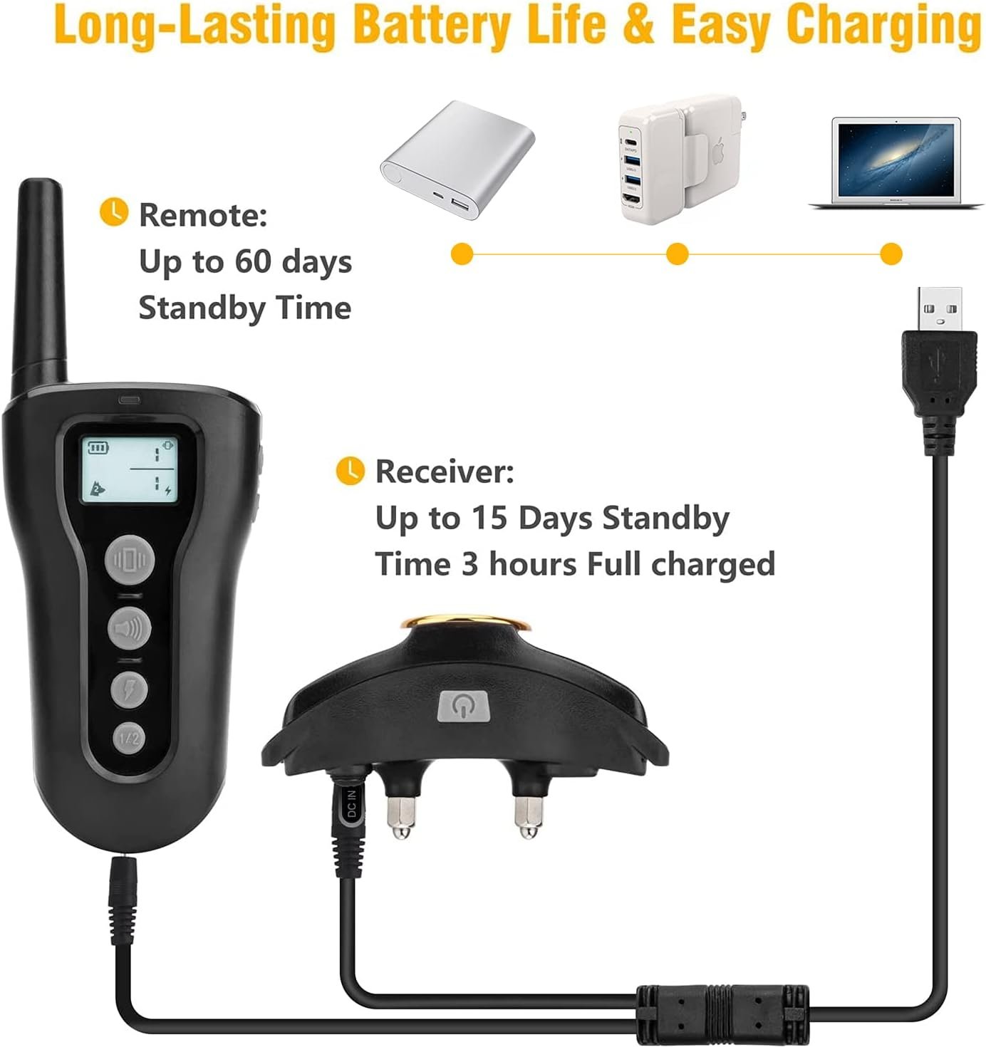 Both the transmitter & the receiver are rechargeable. With high-quality battery, charge in 2-3 hours, and the receiver can last for more than 15 days and remote has up to 60 days standby time.