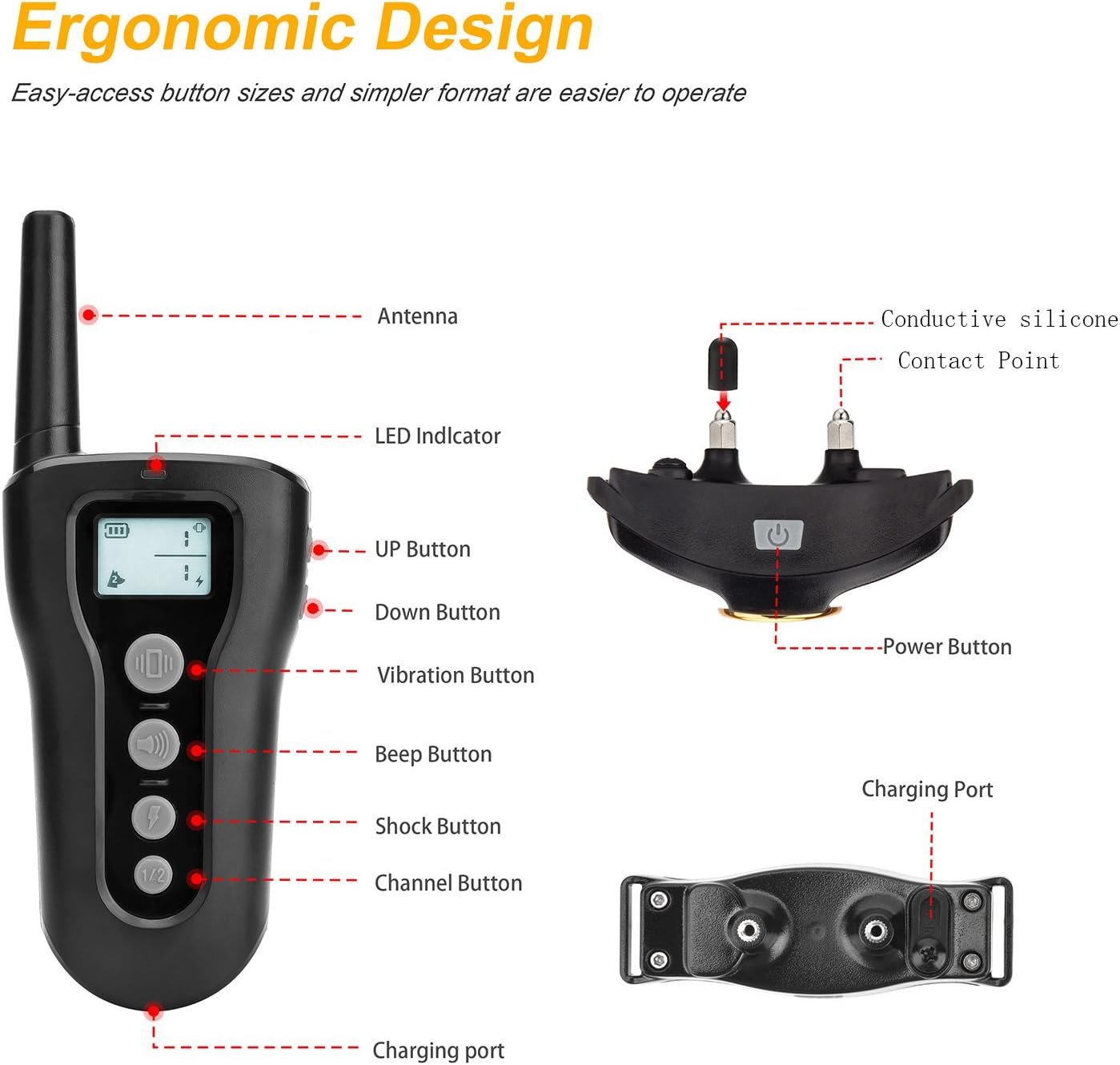Premium, Ergonomic Design — The easy-access button sizes and simpler format are easier to operate for pet owners and help dogs learn commands more effectively. A premium training collar for expert trainers and new pet owners, the conductive silicone prongs are also safe on coats and skin.