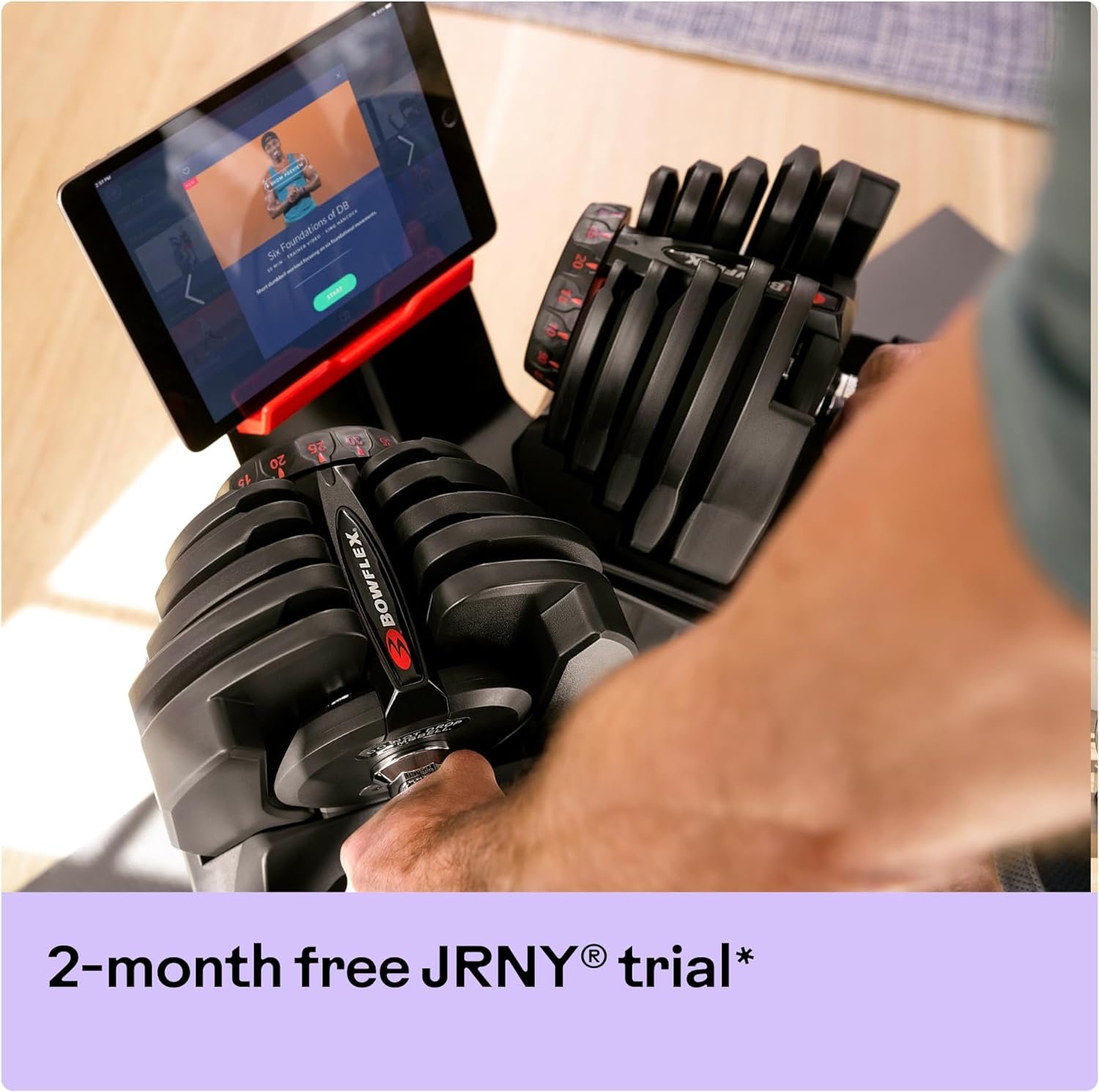 Just like all BowFlex SelectTech dumbbells, with just the turn of a dial you can automatically change your resistance from 10 lbs. all the way up to 90 lbs. of weight. No more picking up 17 different sets of dumbbells to give you the results you want! Our JRNY Mobile-Only Membership is ideal for strength training at home or on the go; try it free for 2 months from your phone or tablet.