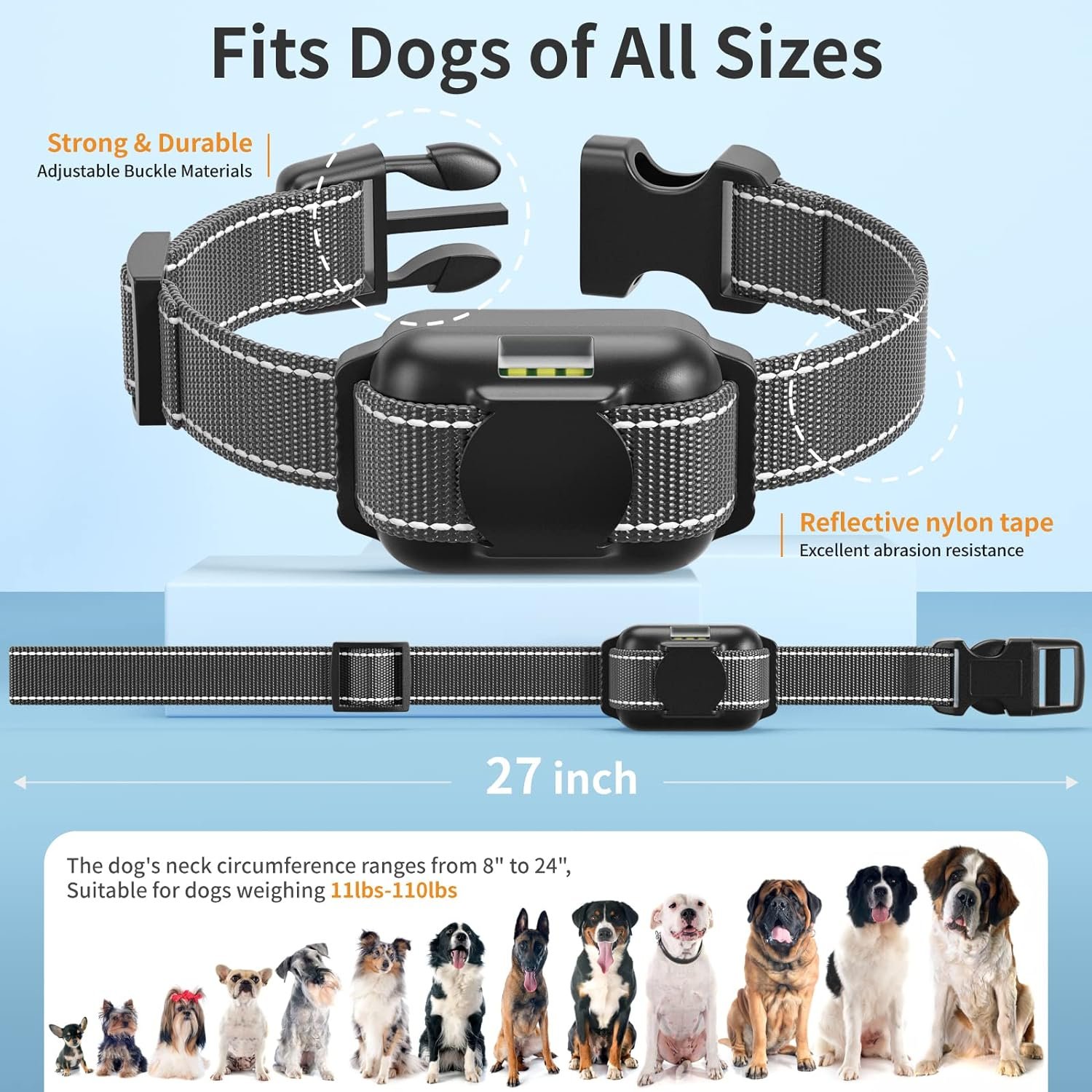 【Emergency Tracking Light & Adjustable Size】Built-in Flash light makes it easy to keep track of the dog while camping or night walks, just remotely turn the light on makes it easy to spot your dog. Electric dog collar with Reflective belt, help you find your dog’s location easily in dark. Our beeping dog collar with neck sizes from 8 to 24 inches and weight from 20-110 lbs;