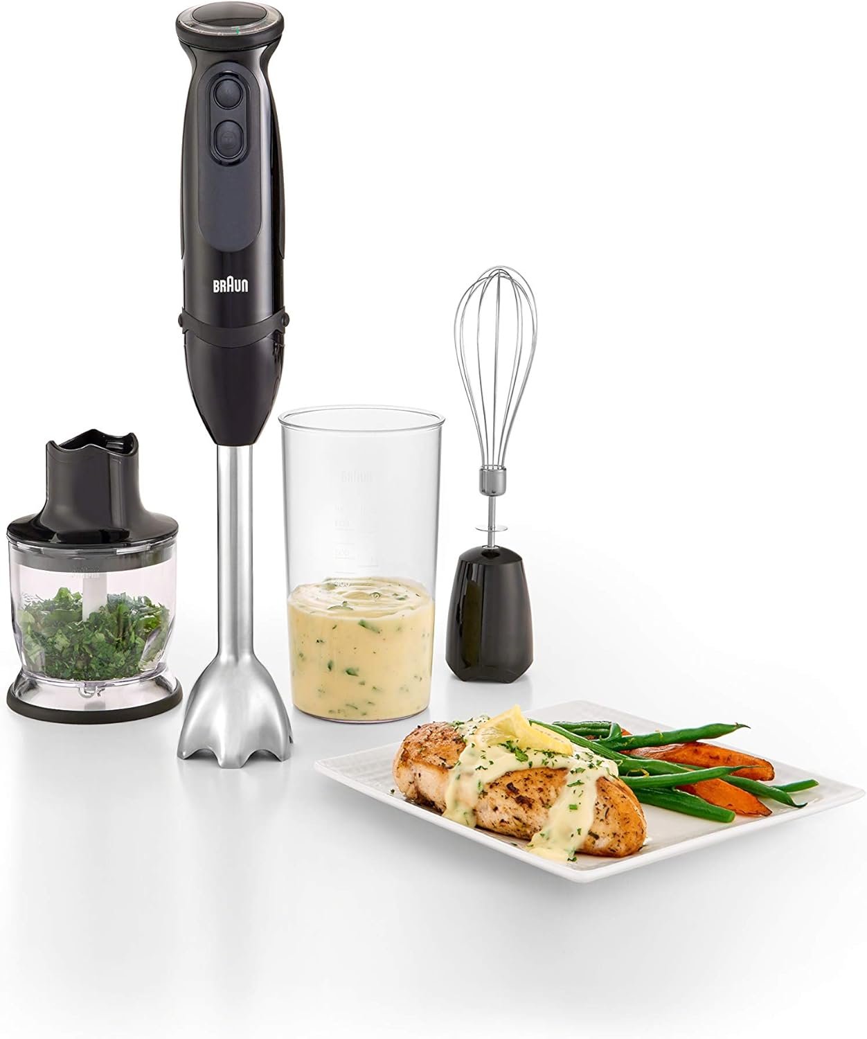 With the Braun MultiQuick 5 Vario Hand Blender, you’ll have maximum blending control, offering multiple possibilities when it comes to your food preparation. VarioSpeed technology provides you with fast, one-handed operation so you can select among 21 distinct speeds to achieve consistently perfect blending, while using the additional TurboBoost speed setting for an extra burst of power exactly when you need it. The world’s first PowerBell technology, with Braun’s unique bell-shaped blending shaft and ultrahard stainless steel blades, draws food inward and reduces suction to produce finer, smoother purees and soups every time. SplashControl technology makes cleanup a breeze, minimizing splashing so your food stays in the pot or bowl, just where it belongs. The EasyClick Accessory System lets you switch out the included 1.5-cup chopper and the whisk, for unrivaled flexibility in meal preparation. The impressive and durable 400 watt motor offers precision-engineered power that’s strong enough to chop, blend or puree even hard foods like nuts or root vegetables with ease. With the MultiQuick 5 Vario Hand Blender in your kitchen, maximum control and multiple possibilities are just the beginning.
