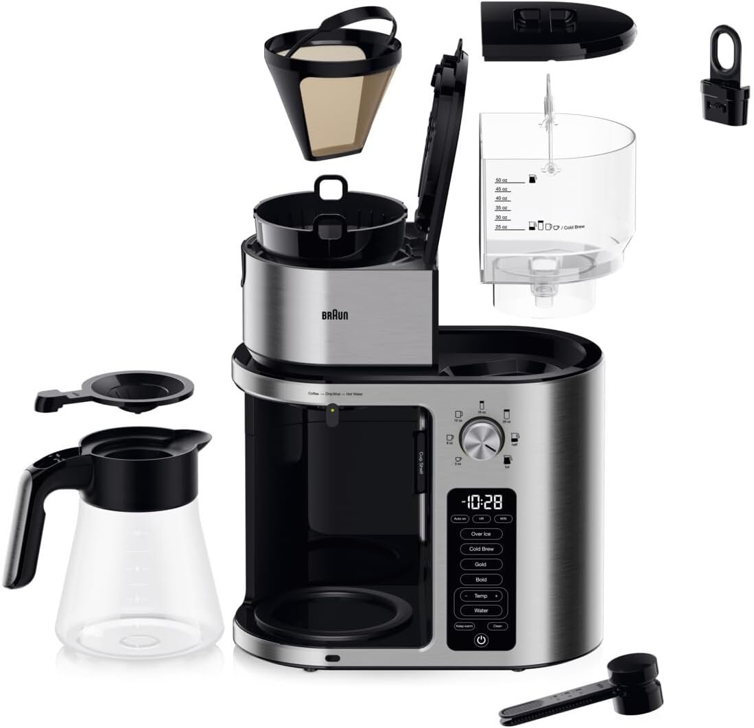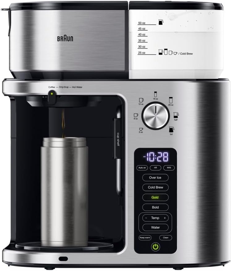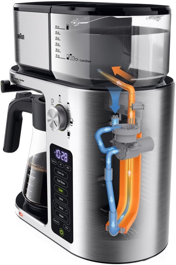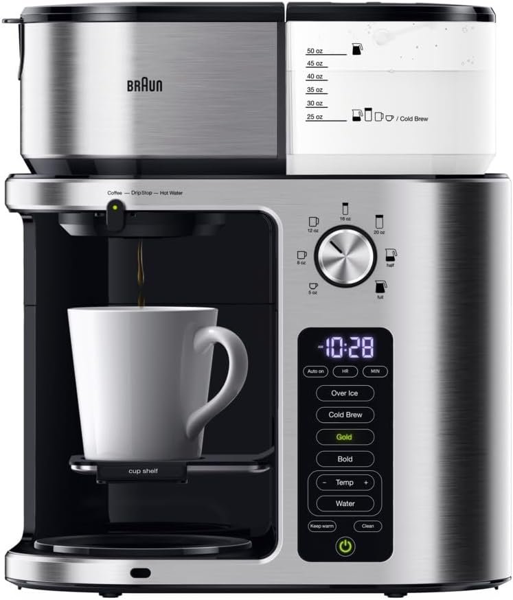 With a longstanding history of crafting quality coffee machines, the Braun MultiServe Plus Coffee Maker represents the next evolution in drip coffee. From single-serve to multi-serve and everything in between, the Braun MultiServe Plus easily adapts to your ever changing needs and coffee preferences, now with the option to prepare cold brew in just minutes! With the touch of a button, BrewChoice Plus lets you customize your coffee to your liking, from gold to bold – even over iced or cold brew. And now, you can prepare a carafe of cold brew in minutes – much quicker than a traditional preparation method. A convenient MultiServe Dial System also makes it easy to brew as much or as little as you need, ranging from a pod-free single cup to full carafe, which is delivered in less than 8 minutes without sacrificing taste. Certified as a Golden Cup by the Specialty Coffee Association, you’re guaranteed great tasting drip coffee, however you prefer it Our ExactBrew System delivers consistent, optimal brewing with every cup, automatically calculating the precise water flow, temperature and speed. There’s even a separate water dispenser for hot water, so you can enjoy fresh brewed tea without the coffee taste. Sleek and streamlined with a stainless steel design, the Braun MultiServe Plus Coffee Maker offers the convenience and versatility you crave, while never compromising the quality of your brew. It’s drip coffee, evolved.