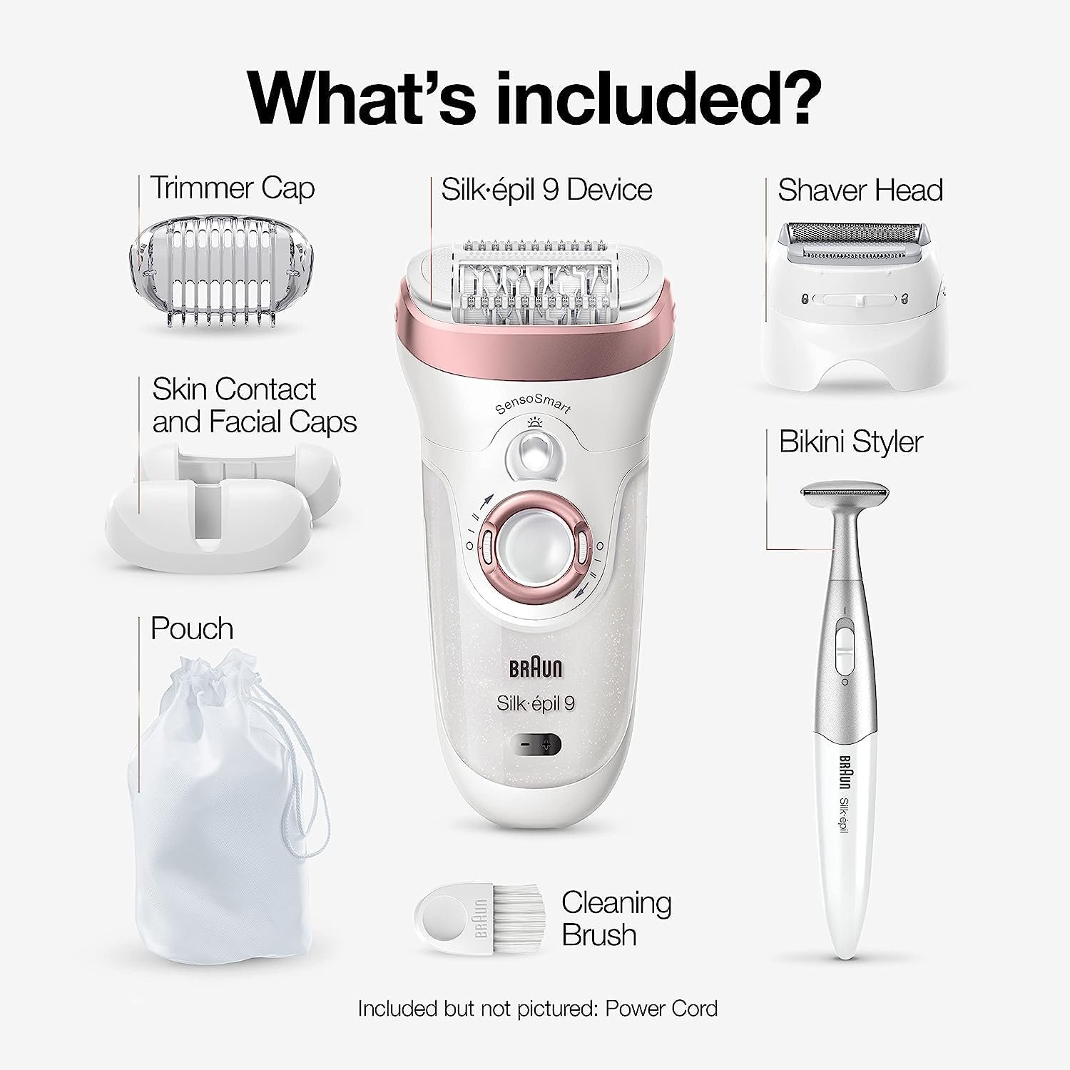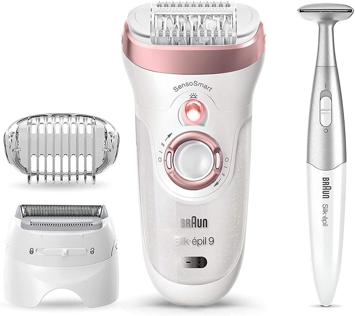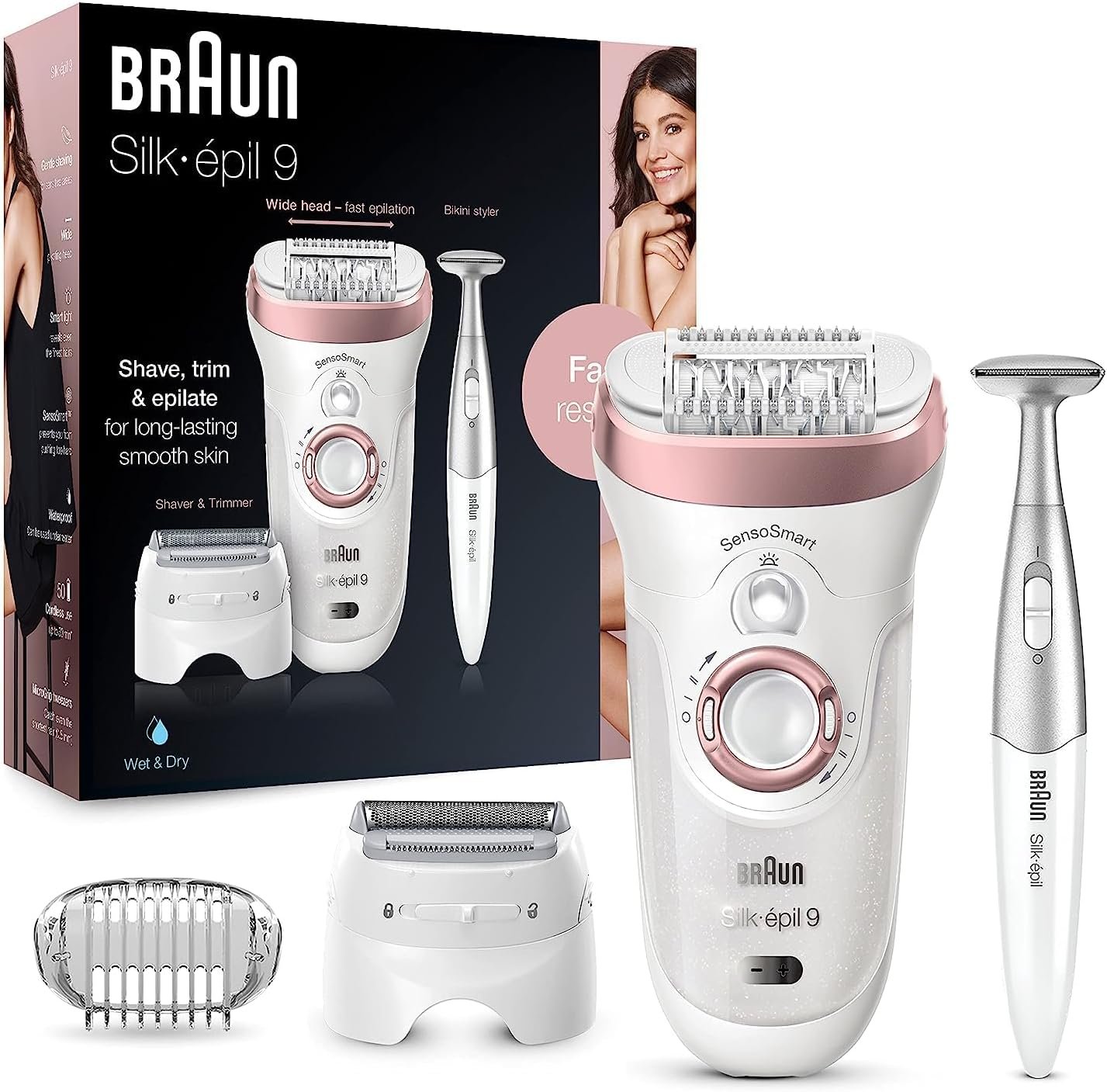 Braun Silk-epil 9 SensoSmart epilator is the World’s 1st smart epilator. It includes innovative pressure sensor technology to guide your epilation and remove even more hair in one stroke. The 40% wider epilator head removes 4x shorter hair than wax. Cordless and Wet & Dry, the epilator can be used in the bath or shower. With 7 extras, including a body and face trimmer for easy maintenance of sensitive areas. vs other Braun epilators. Long-lasting battery. Braun Epilators (SE5, SE7, SE9, SE9 Flex) are GreenCircle certified as a ‘sustainable solution with certified energy savings’. The other accessories and attachments in the box were not assessed by GreenCircle.