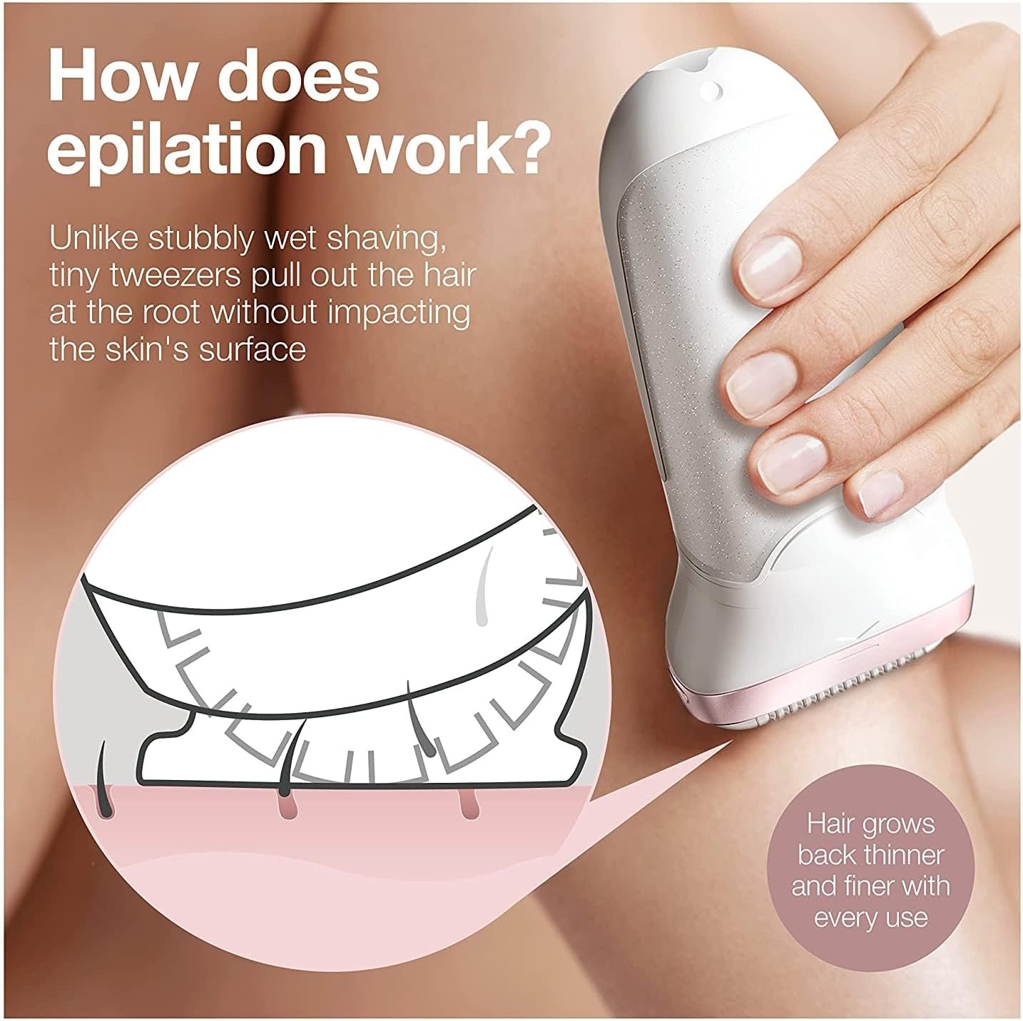 EFFICIENT: remove 4x shorter hair than wax, adapts to every contour for an efficient epilation, even in difficult areas like the knee and underarm