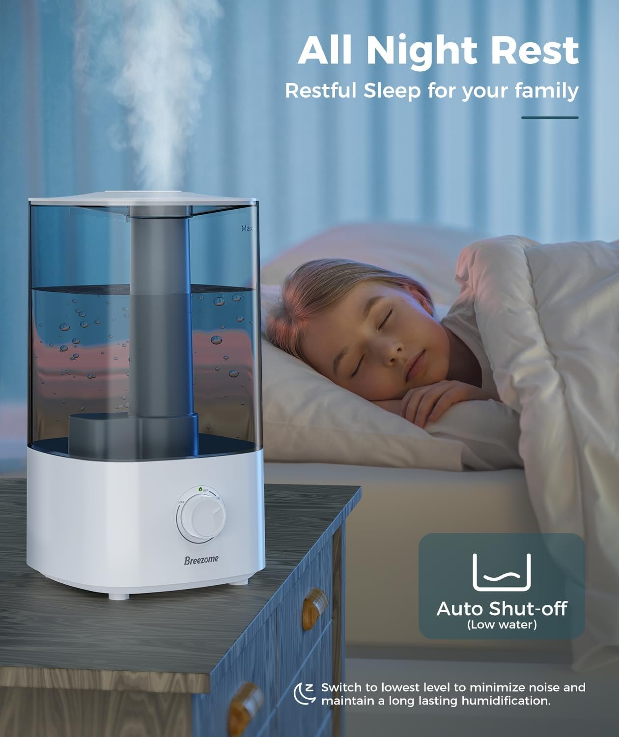 SAFE TO USE: By easily turn the knob to the lowest setting, our humidifier can work in lower noise to protect your undisturbed good sleep. It would automatically shut off when water runs out. Safe for you and your whole family.