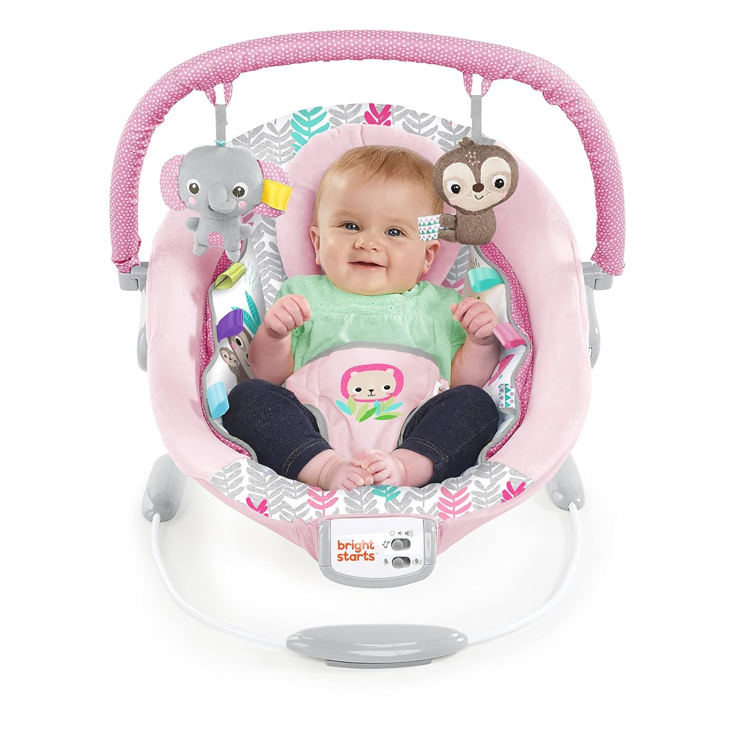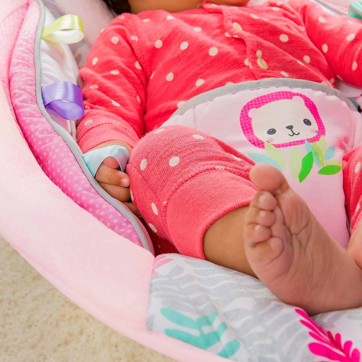 Every bounce is a jungle of joy with the Rosy Vines bouncer from Bright Starts. Made with plush fabrics, this is the snuggliest bouncer for your little one. The deep comfortable seat keeps baby secure, and the removable headrest adds a cuddly cushion for your little one’s head. Non-slip feet and a 3-point harness make this baby bouncer wiggle-proof for every wild child. Baby’s soon-to-be favorite seat is surrounded by the Taggies babies just love to touch! Hanging from the toy bar baby will discover two plush animal pals to reach, bat and grasp. When baby needs some time to relax, and you need a second set of hands, this bouncer’s soothing motions, melodies and vibrations will help keep her calm.