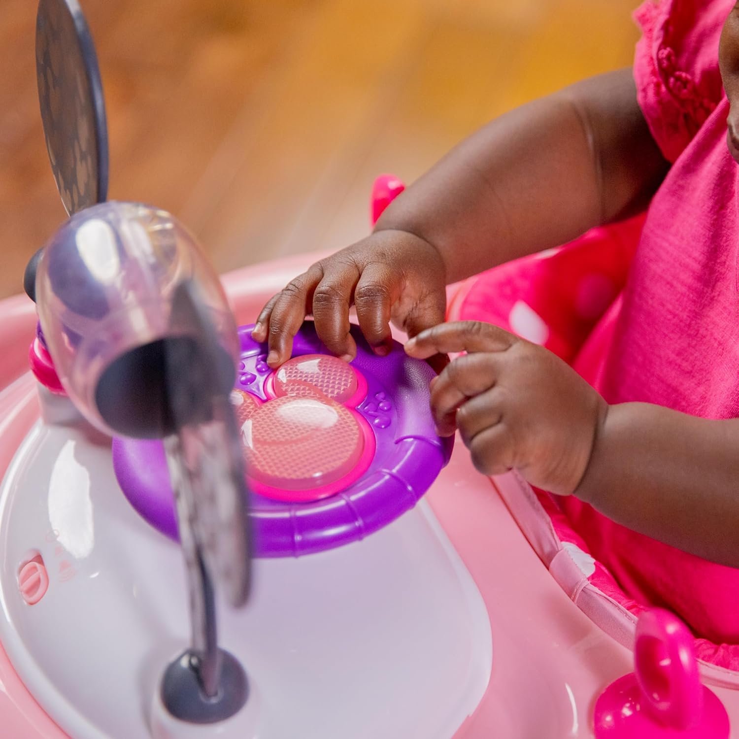 Designed with a sturdy frame and rubber brake feet to keep baby safe while she plays; 23.5″ (H) x 25.5″ (W) x 28.5″ (D); assembly required; powered by 3 AA batteries (not included)
