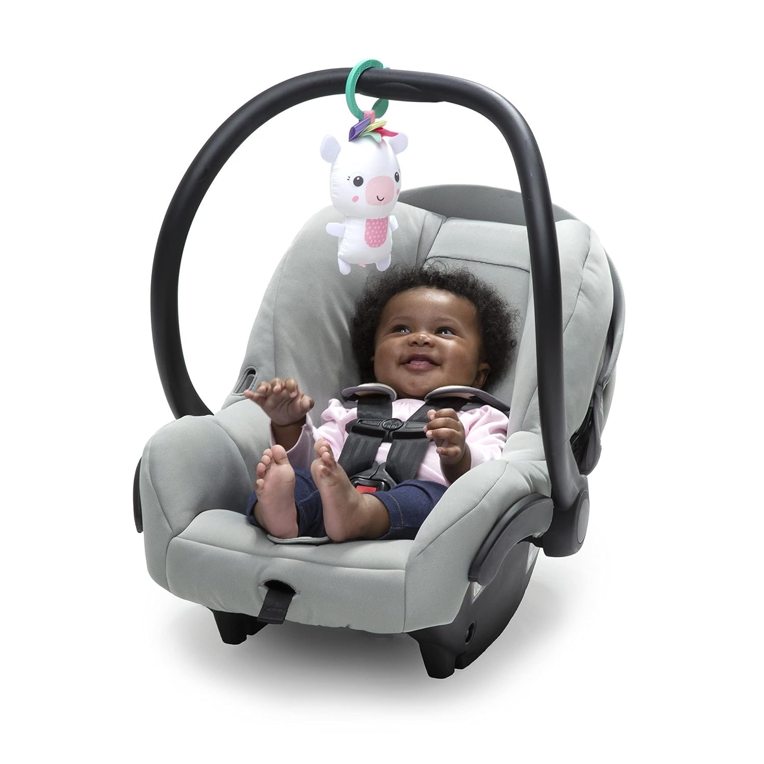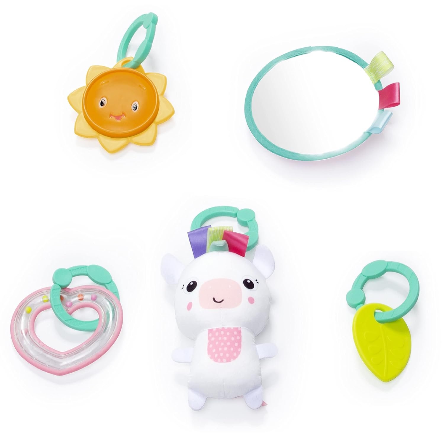 5 On-the-Go Baby Toys: Includes a plush unicorn that plays music, baby safe mirror, sun rattle, leaf toy and heart shaped ring rattle. The unicorn toy and mirror include satin Taggies that babies love to touch!