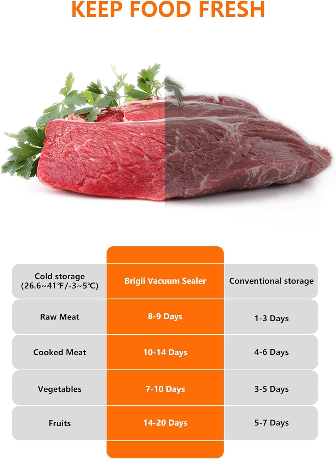 【Extended Freshness】 Elevate your kitchen experience with the Brigii Vacuum Sealer! Preserve food freshness longer with its advanced vacuum sealing technology. Say goodbye to food waste and welcome prolonged flavor retention.