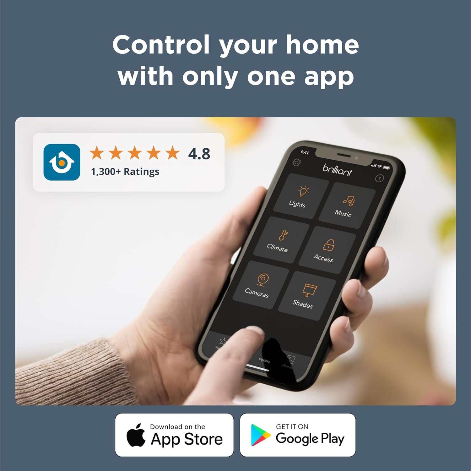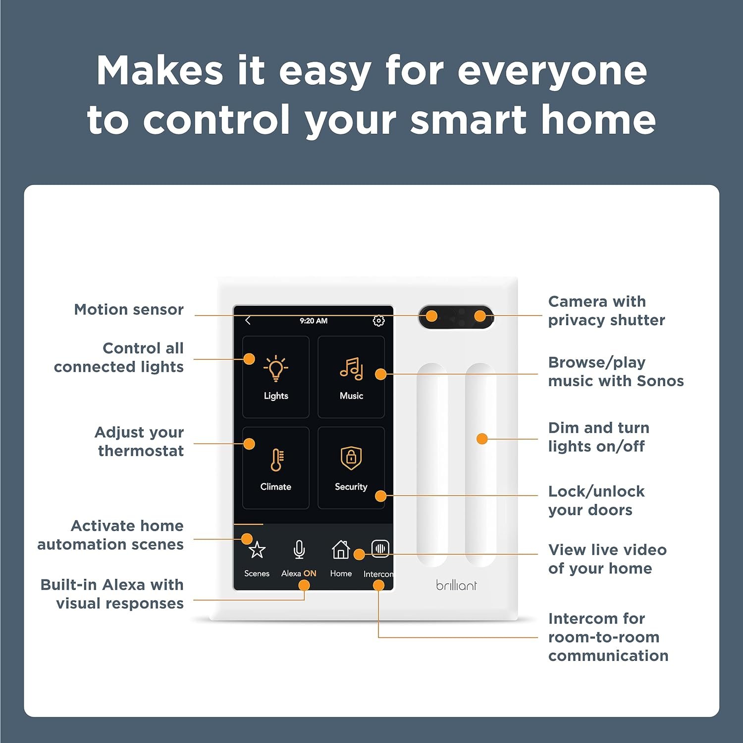 Brilliant touchscreen panels make it easy for everyone to control lighting, music, cameras, & more