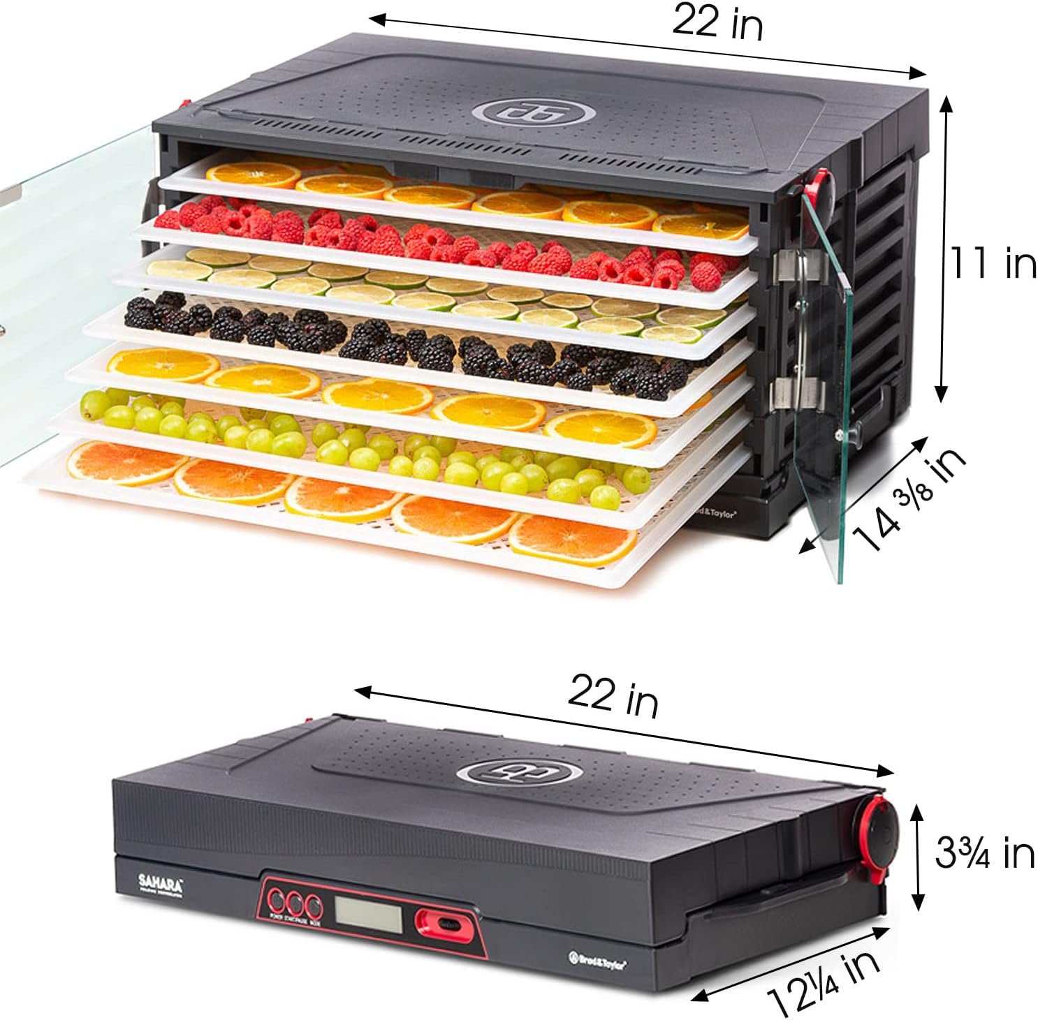 Over 1 square meter (11 square feet) of drying area, food-safe easy-to-clean polypropylene plastic shelving (BPA Free), digitally-controlled 700W dual heaters, automated dual time / temperature controls, quiet and high-efficiency circulating airflow, filtered air intake, glass doors and internal power cord storage. Nylon zippered shelf case for shelf storage included.