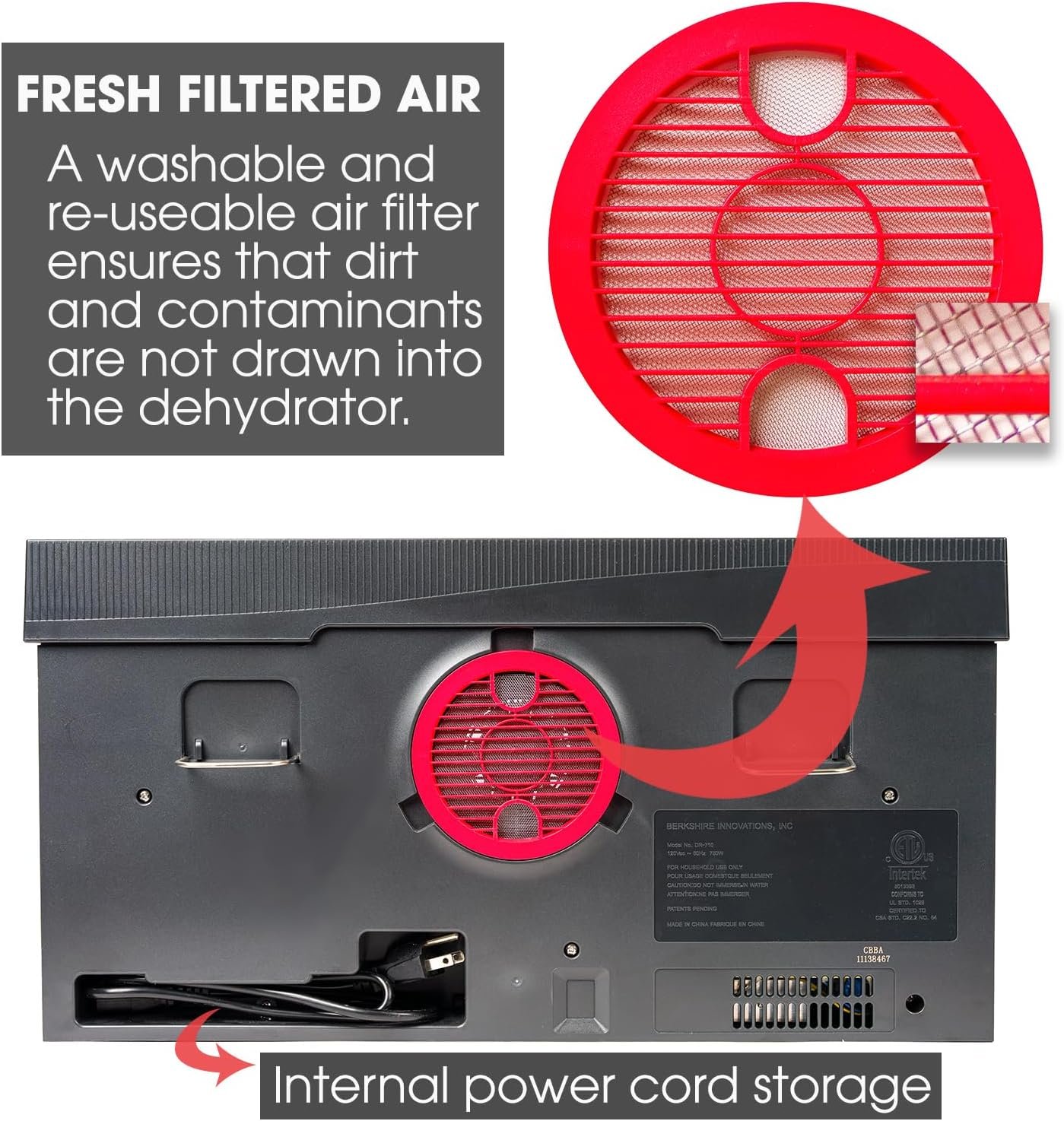 Fresh filtered air: A washable and re-useable air filter ensures that dirt and contaminants are not drawn into the dehydrator. 120V use only.
