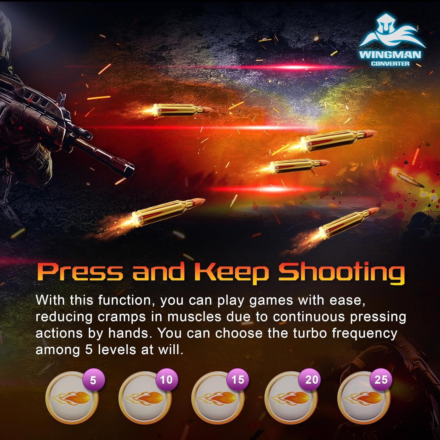 The Wingman PS2 unleashes your controller’s potential with Turbo function. 5 shooting speeds available for you to skip lengthy, repetitive clicks and fire out easily!