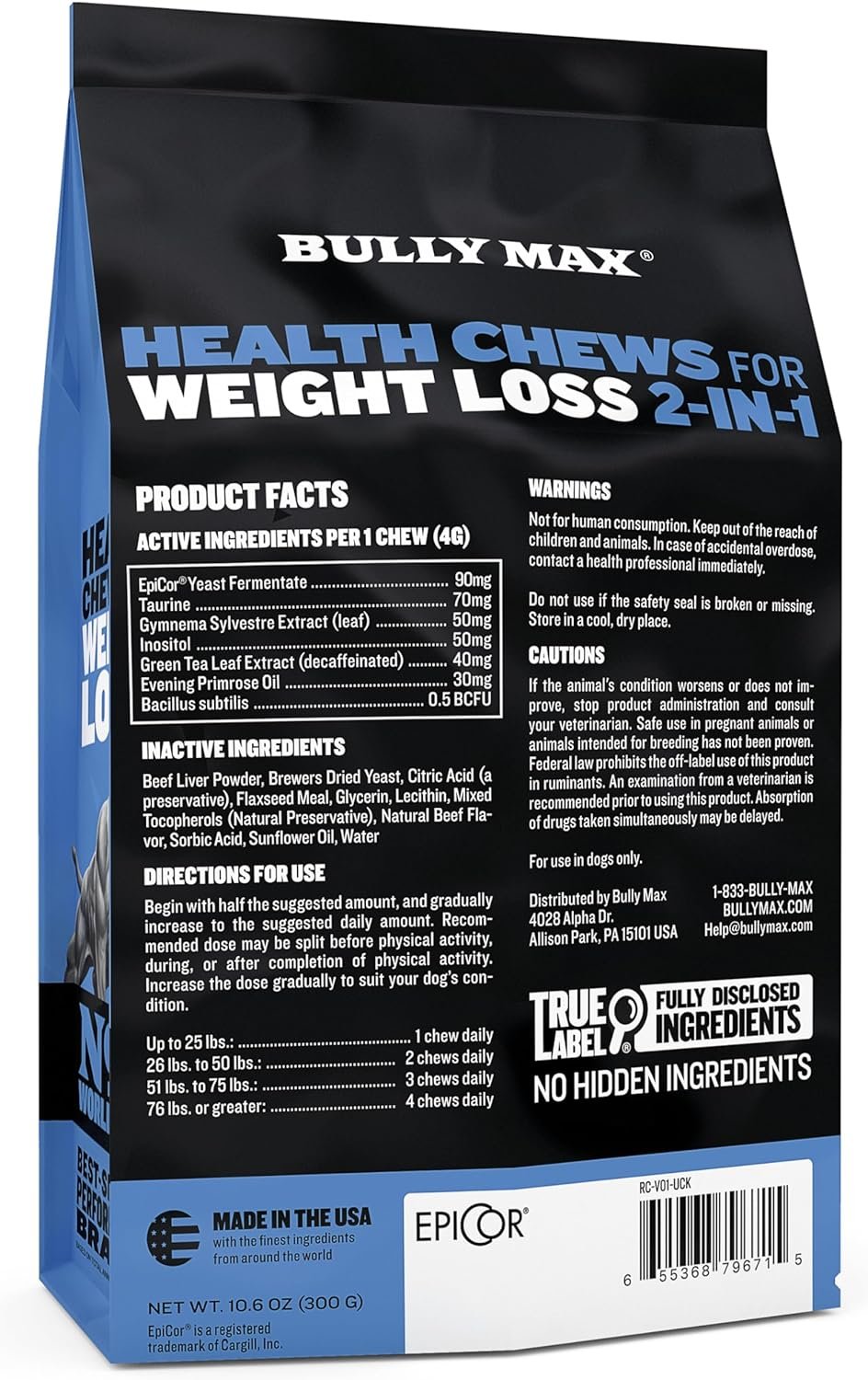OPTIMIZED WEIGHT MANAGEMENT & ENERGIZING ANTIOXIDANT SUPPORT: Achieve and sustain your dog’s ideal body weight with Bully Max Health Chews for Weight Loss, a vital component of your weight management dog food strategy. Infused with decaffeinated Green Tea Leaf Extract, this fat burner and antioxidant are key to a healthier and more balanced lifestyle, ensuring your dog feels energetic and maintains consistent energy levels.