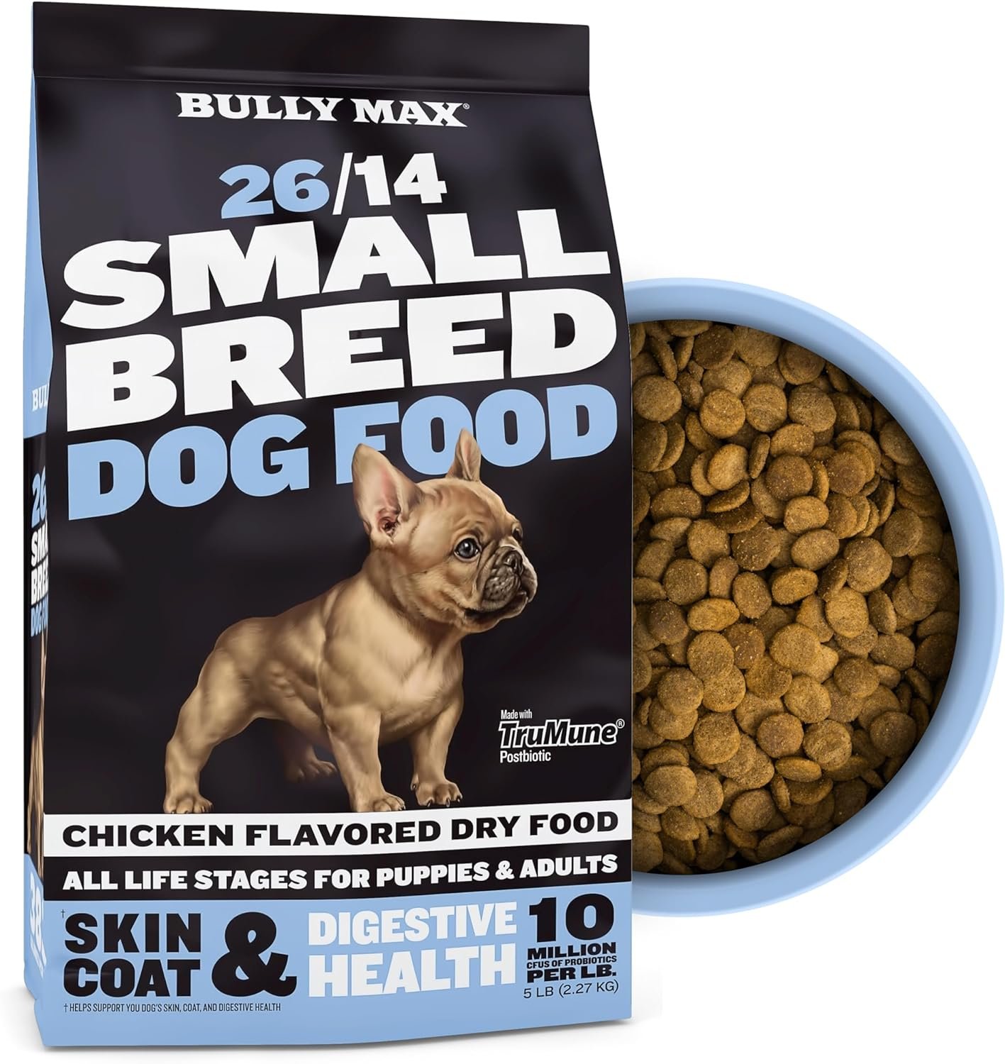 Bully Max 26/14 Small Breed Dry Dog Food is a premium choice, meticulously formulated for small breeds, including Frenchie or French Bulldogs. This 5-pound bag blends high-quality chicken and rice into soft (not hard), small kibble and little bites, making them easily digestible and ideal for optimal nutrient absorption. Made with the finest natural ingredients enhanced with vitamins, minerals and other nutrients, It’s a best small breed food choice for dogs of all life stages – from energetic puppies to adults and seniors. Enriched with TruMune postbiotic, the formula is scientifically proven to enhance digestive health and immune function, backed by over 425 research studies and 120 peer-reviewed publications. This addition also contributes to a 15% boost in vitality and energy levels, making it more than just a regular meal for your pet. Bully Max 26/14 goes beyond basic nutrition. It’s specially crafted to appeal to the palates of small dogs, promoting not only their health but also catering to their taste preferences. The formula’s natural ingredients work together to support healthy skin and a glossy coat, enhancing the overall wellbeing of small breed dogs like French Bull dog, Pug, Shih Tzu, Chihuahua, Dachshund, Yorkie or Yorkshire Terrier, Boston Terrier, Maltese, Toy Poodle, Pomeranian, Corgi, Miniature Schnauzer This low fat dry dogfood is a comprehensive dietary solution, providing complete and balanced nutrition for small breeds at every stage of life. Whether you’re nourishing a puppy, maintaining the health of an adult dog, or caring for a senior, Bully Max 26/14 meets their dietary needs with precision and care. bullymax comida para perro, perros adultos, comida para perros pequeños, grain free kibbles, dry dog food small breed bulk package, older dogs adults with sensitive stomachs, limited ingredient dog food, muscle builder, weight gainer, medium breed food for allergies, small breed dog supplement for frenchies.