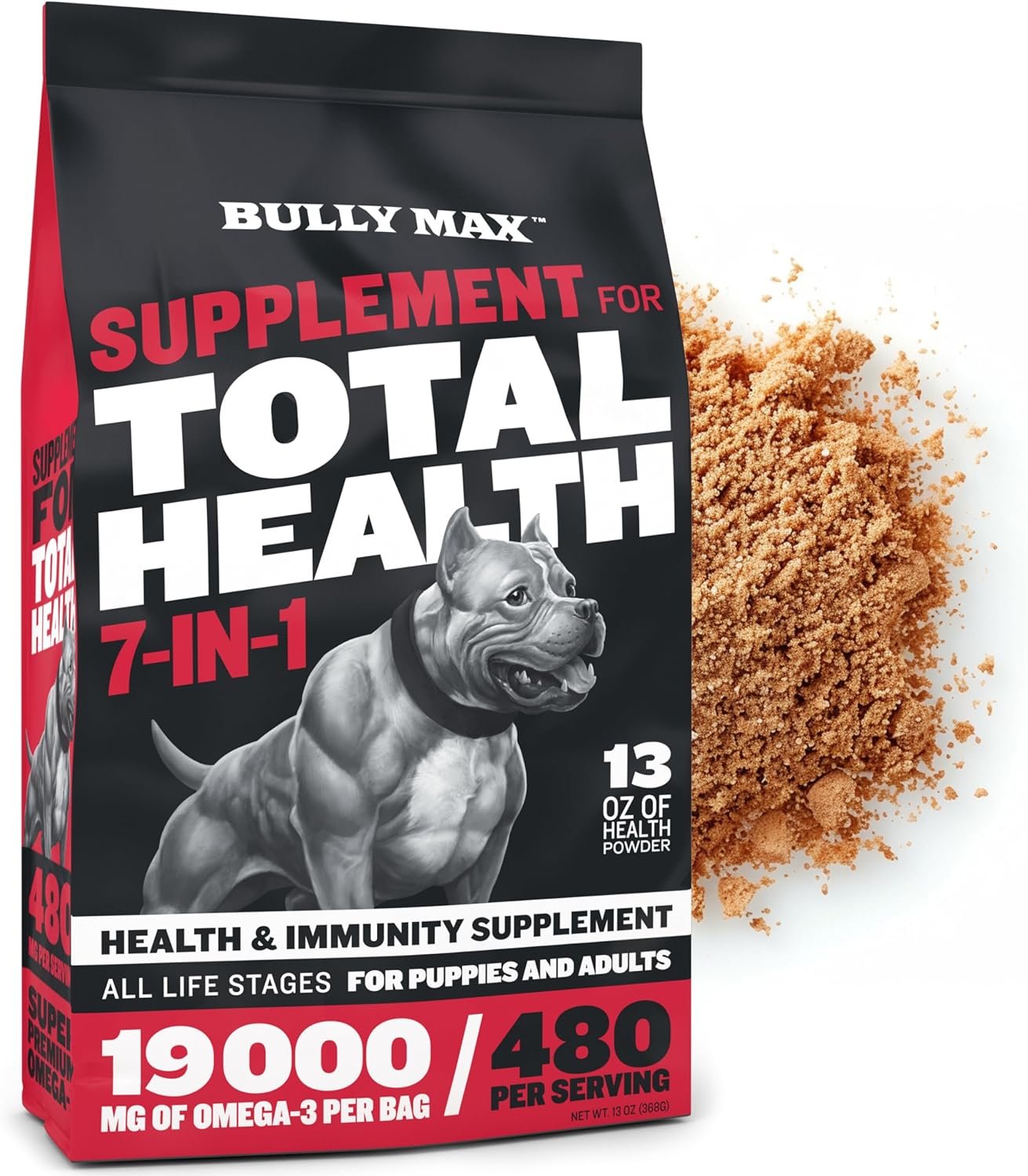 DOG SKIN & COAT HEALTH ENHANCER: Bully Max Total Health Dog Food, rich in Omega 3 fatty acids, vitamins C and E, and Choline, is a premier skin and coat supplement for dogs. This dog multivitamin powder enhances coat shine and joint strength, while also improving immune defense with added digestive enzymes and Chondroitin. Free from corn, wheat, fillers, and other unhealthy ingredients, it’s packed with dog supplements & vitamins to ensure only the best for your pet’s well-being.