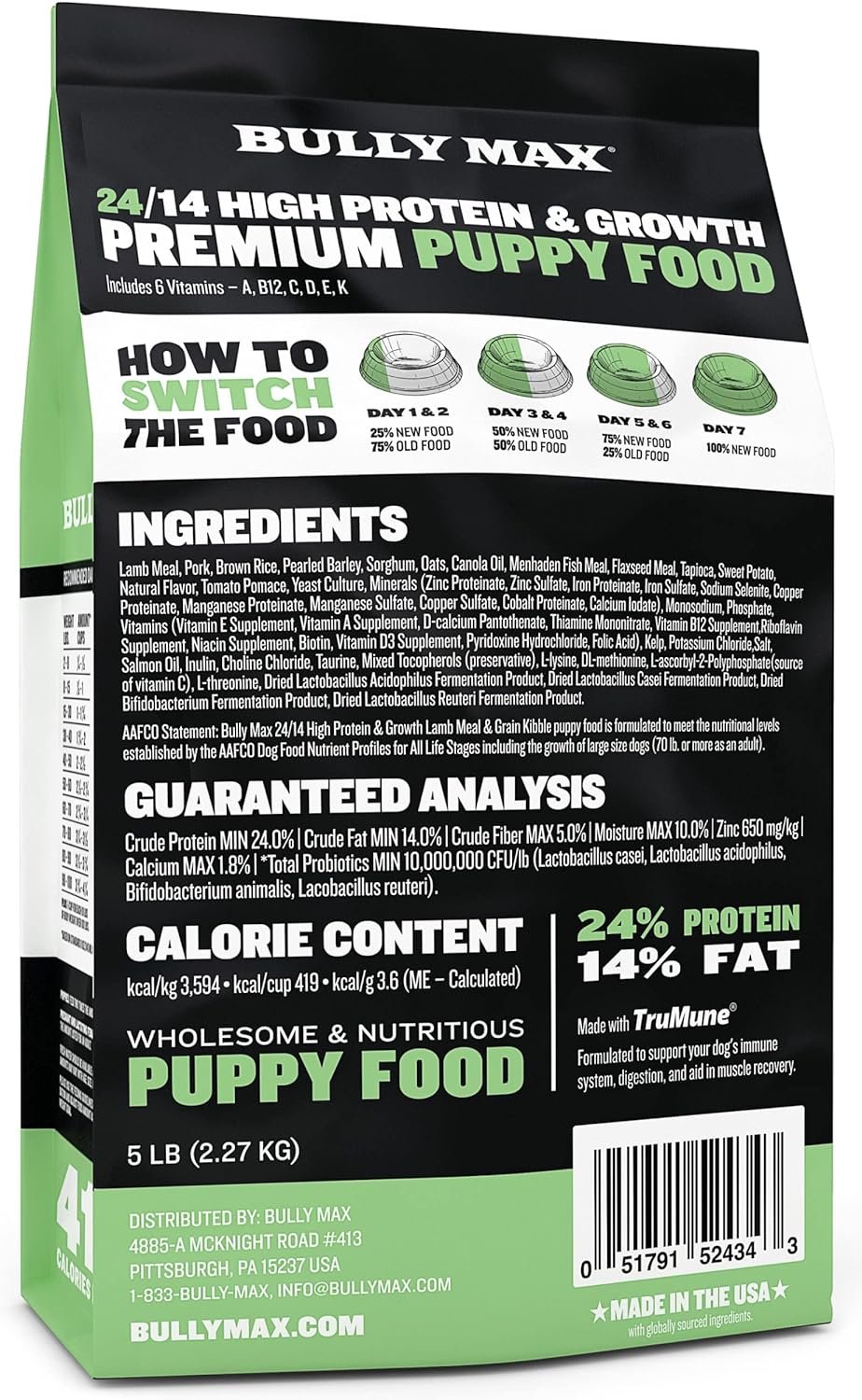 NUTRIENT-RICH PUPPY GROWTH FORMULA: Bully Max Dog Food features a 24/14 High Protein & Growth formula, boasting 419 calories per cup for the energy needs of growing puppies. Enriched with vitamins A, B12, C, D, E, K, and postbiotics for gut and immune support, perfect for all breeds, including large breed and small breed puppies. It also promotes healthy skin and provides itch relief, thanks to Omega fatty acids, making it an excellent choice for your puppy’s overall development and well-being.