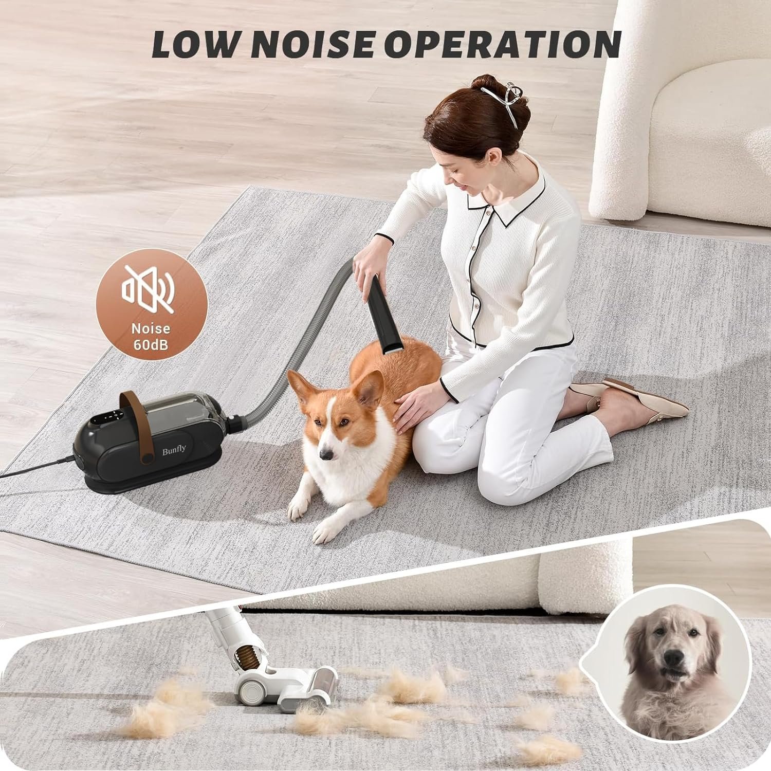 【Low Noise Technology】Bunfly adopts the latest noise reduction technology, the noise is only 65dBA, effectively protecting pets’ sensitive hearing. Novice pets can adapt slowly from the first gear.We suggest grooming your pet with our brush before trimming pet hair, treating your pet with little snacks to avoid making your pet nervous because of vacuuming noise, which conclusively makes the grooming experience even more enjoyable.