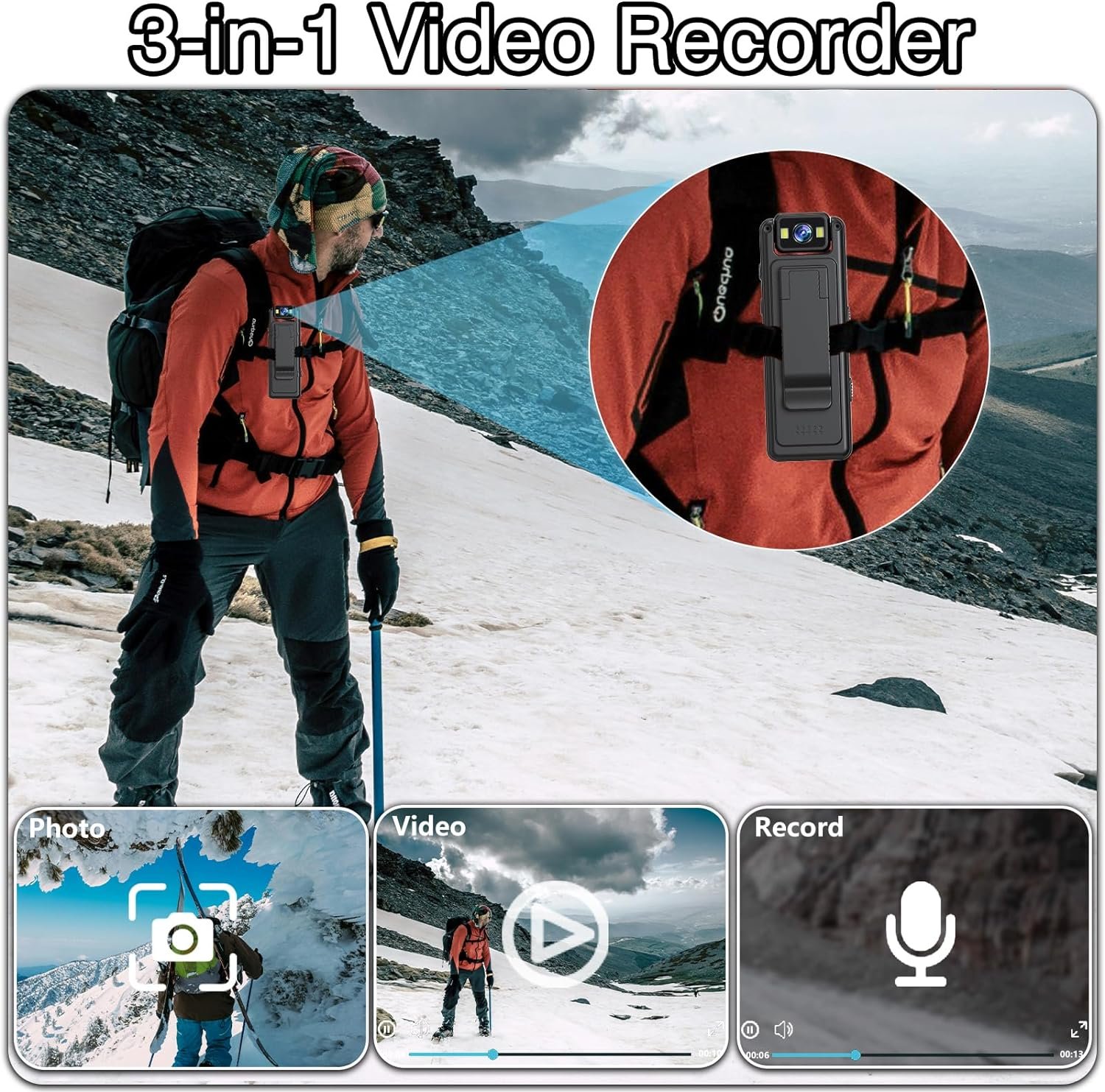 【Rechargeable Large Battery】With built-in 1200mAh battery, it can achieve 5-hours continuous video recording and 12-hours WAV recording. You can also keep it charged in the outlet or powerbank for 7/24 recording. Besides, it has a back clip that you can easily place it on your pocket and bags. 1/4 screw hole at the bottom makes it easily attached to your bike mount(not included). You can reset assured that it can meet your outdoor needs.