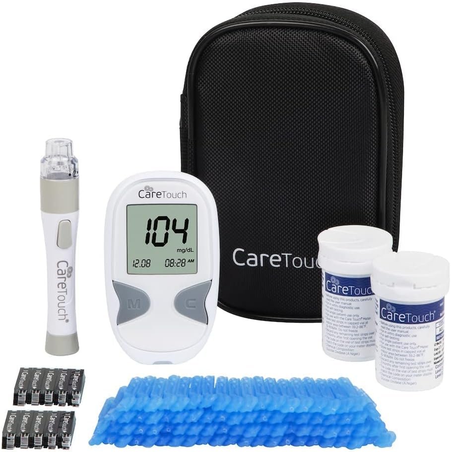 COMPLETE DIABETIC SET -The glucose meter kit with strips and lancets includes (1) Care Touch blood sugar meter, (100) blood glucose test strips for diabetes, (1) lancing device, (100) lancets for diabetes testing, (1) 3-volt lithium battery, (1) glucose meter case for your blood sugar tester and diabetic supplies.