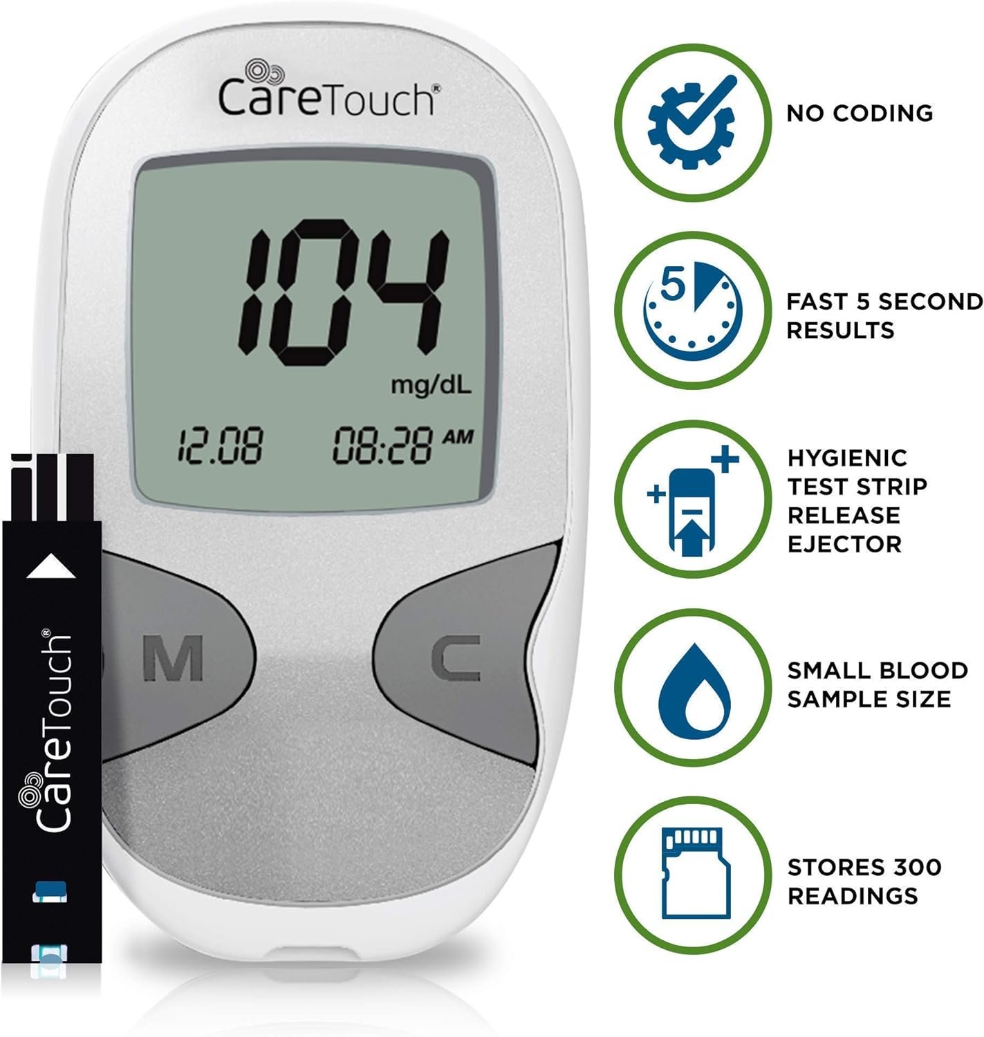 QUICK AND EASY TO USE – The Care Touch blood sugar test kit delivers results in only 5 seconds with a 0.5µL blood sample. No programming is needed since our blood glucose monitors automatically recognize batch codes encrypted on caretouch blood glucose test strips. Our state-of-the-art glucometer kit with strips and lancets includes single-touch strip ejection, so you can hygienically remove used diabetic test strips.