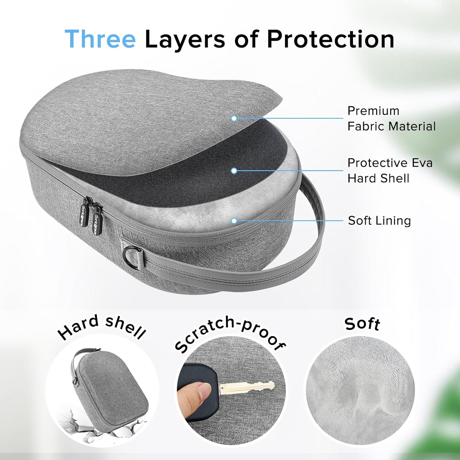 [Durable Material] The oculus quest 2/quest 3 carry case is enveloped in a premium fabric (no harmful odor), 6.5mm thick EVA made shell and soft lining which resistant to fall, impact, dust and splash, better protects your quest 2/3.